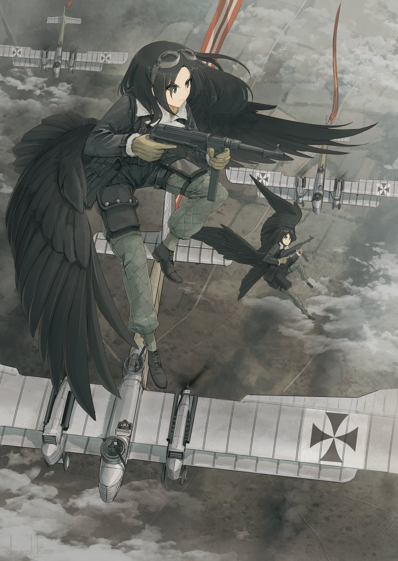 2girls aircraft airplane asterisk_kome belt_pouch black_footwear black_hair black_jacket black_wings bomber_jacket brown_gloves cloud cross feathered_wings flying full_body gloves goggles goggles_on_head green_pants gun highres holding holding_weapon iron_cross jacket laura_jumo long_hair mp40 multiple_girls pants pouch submachine_gun weapon winged_fusiliers wings