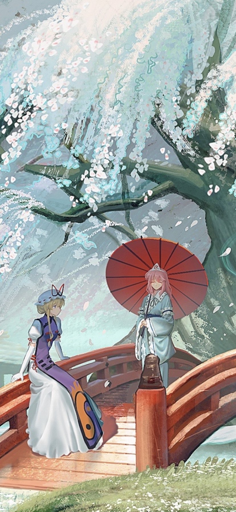 ^_^ blonde_hair blue_kimono bridge cherry_blossoms closed_eyes dress e_(you33ou) elbow_gloves closed_eyes frilled_dress frilled_kimono frills ghost gloves hakugyokurou hat hat_ribbon highres hitodama holding holding_umbrella japanese_clothes kimono long_sleeves looking_at_another medium_hair mob_cap obi parasol perfect_cherry_blossom pink_hair puffy_short_sleeves puffy_sleeves purple_eyes red_ribbon ribbon saigyouji_yuyuko sash shadow short_sleeves sitting standing tabard touhou tree triangular_headpiece trigram umbrella wavy_hair white_dress wide_sleeves yakumo_yukari yin_yang yin_yang_print