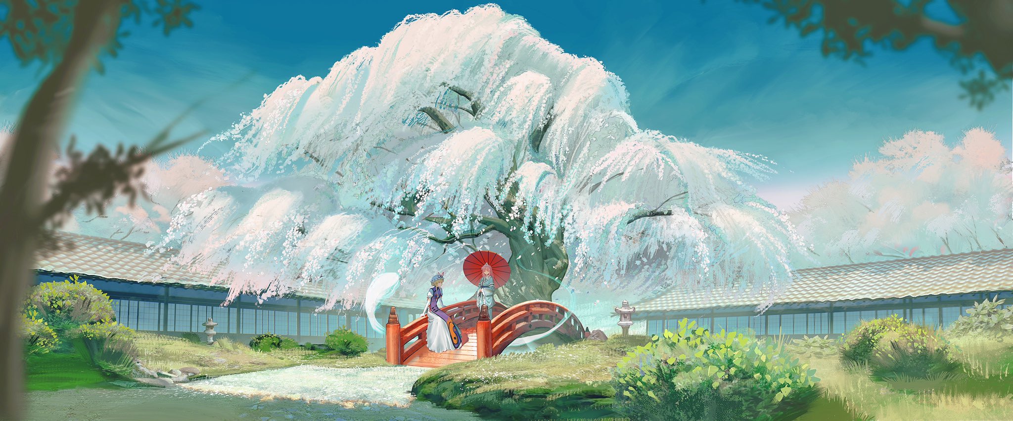 blonde_hair blue_kimono bridge building bush cherry_blossoms clear_sky cobblestone dress e_(you33ou) elbow_gloves frilled_dress frilled_kimono frills ghost gloves grass hakugyokurou hat hat_ribbon highres hitodama holding holding_umbrella japanese_clothes kimono long_sleeves medium_hair mob_cap obi parasol perfect_cherry_blossom pink_hair puffy_short_sleeves puffy_sleeves purple_eyes red_ribbon ribbon saigyouji_yuyuko sash scenery shadow short_sleeves sitting sky standing stone_lantern tabard touhou tree triangular_headpiece trigram umbrella wavy_hair white_dress wide_shot wide_sleeves yakumo_yukari yin_yang yin_yang_print