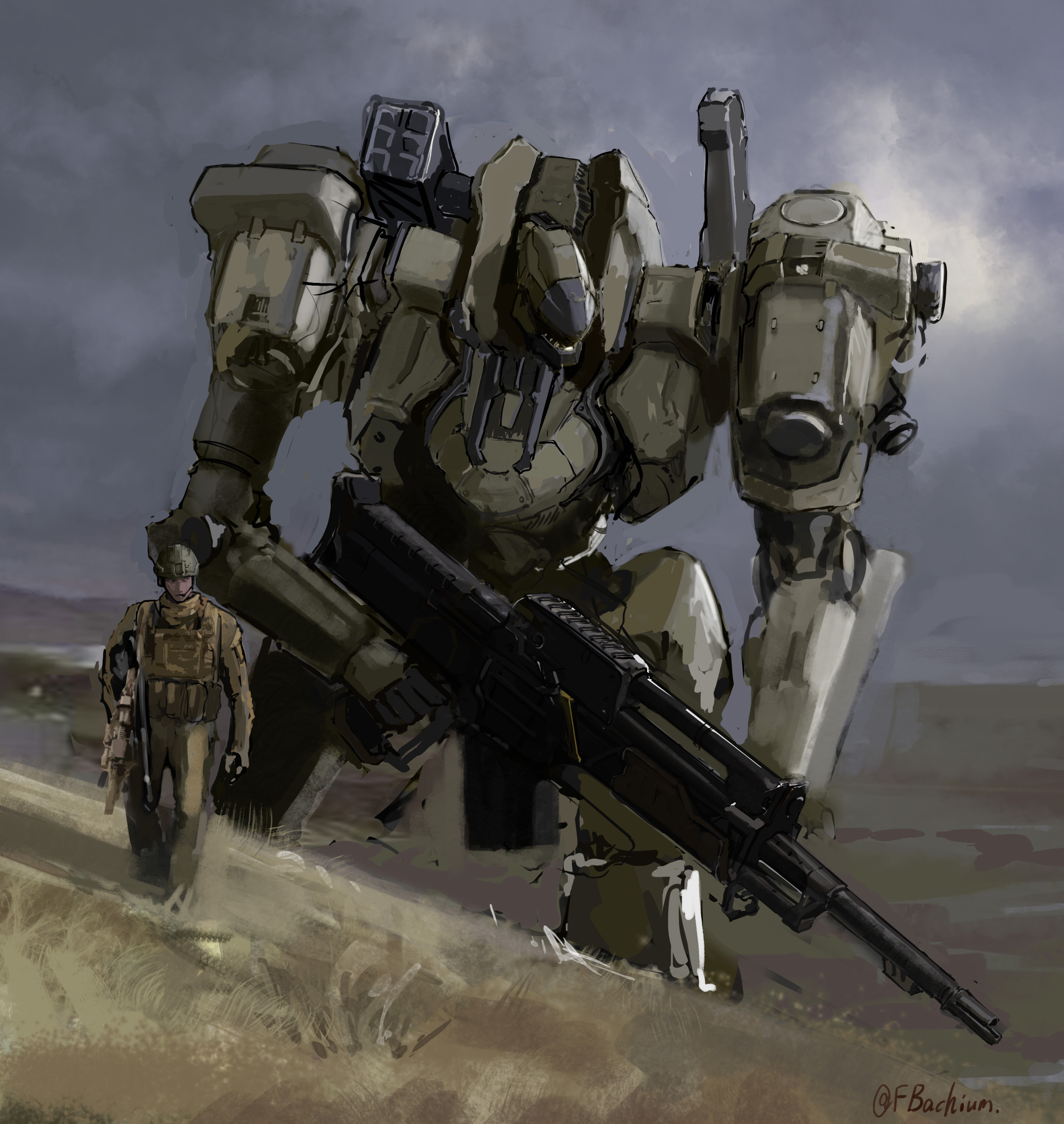 1boy absurdres gun headset helmet highres holding holding_gun holding_weapon kneeling looking_down male_focus mecha mechium military missile_pod on_one_knee original robot science_fiction soldier walking weapon