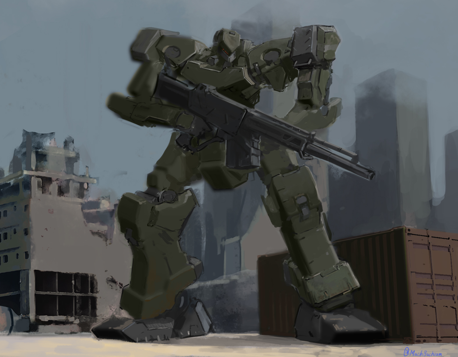 artist_name gun highres holding holding_gun holding_weapon looking_down mecha mechium no_humans original robot science_fiction shipping_container smoke solo visor weapon