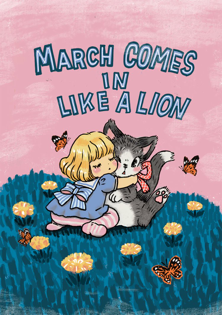 1girl animal animal_hug back_bow blonde_hair blue_shirt blush_stickers bob_cut bow bug butterfly cat child closed_eyes copyright_name dot_nose facing_viewer field flower flower_field full_body grass hug insect kawamoto_momo no_shoes orange_flower oversized_animal pantyhose parted_lips pink_background pink_pantyhose puffy_short_sleeves puffy_sleeves sailor_collar sangatsu_no_lion shirt short_sleeves simple_background sitting solo striped_bow striped_clothes striped_pantyhose umino_chika white_sailor_collar