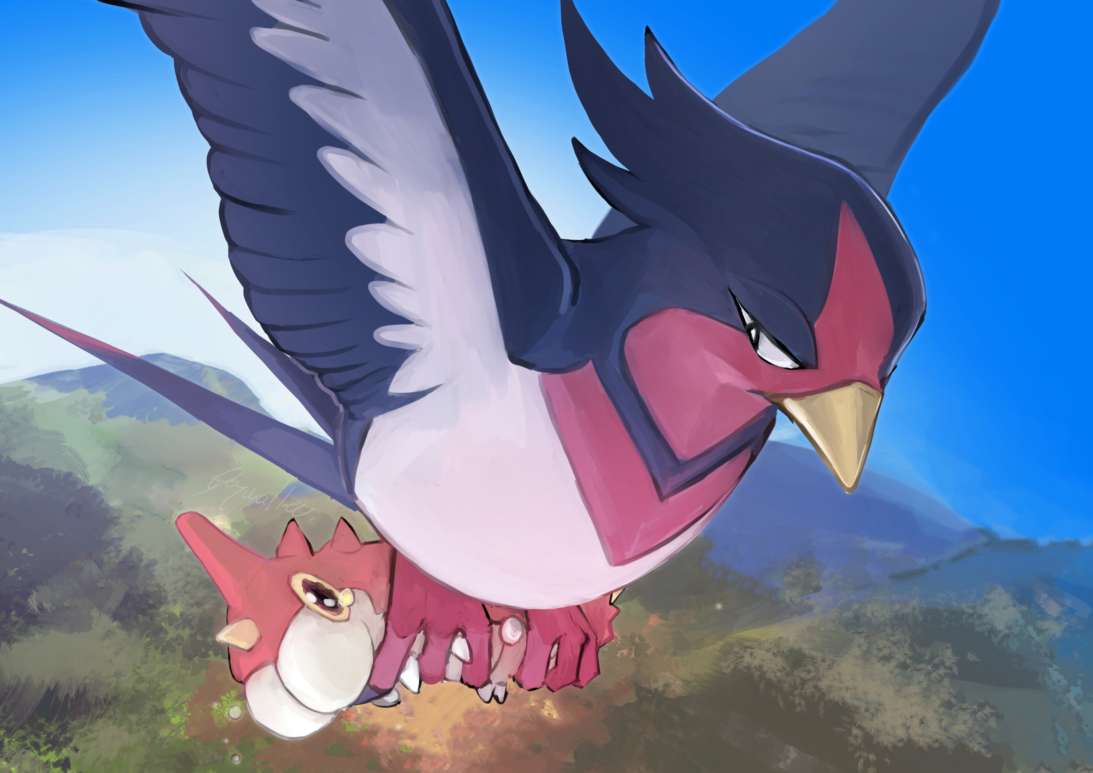 absurdres animal_focus bird black_eyes blue_sky bug carrying colored_sclera creature_as_food crying day flying gen_3_pokemon gradient_sky half-closed_eyes highres impending_doom looking_at_another looking_down nintendo no_humans outdoors pokemon pokemon_(creature) pokemon_mystery_dungeon pokemon_mystery_dungeon:_explorers_of_time/darkness/sky red_eyes scared sky sushimi_(nijoujou) swellow tears wavy_eyes wurmple yellow_sclera