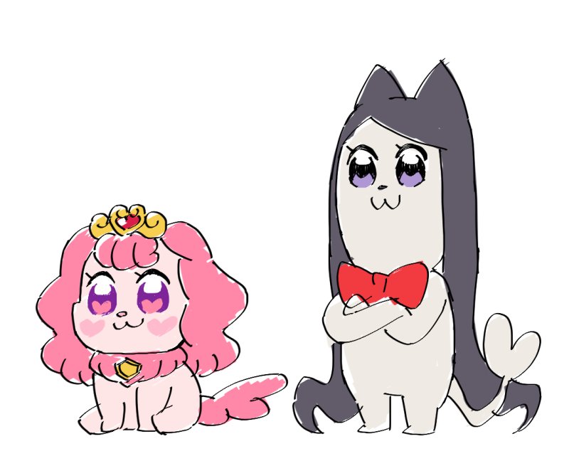 :3 bkub_(style) black_hair bow bowtie cat commentary crossed_arms dog gift_art go!_princess_precure hair_ornament heart heart_hair_ornament heart_in_eye heart_tail long_hair medium_hair miss_siamour multicolored_eyes nakatani_yukiko no_humans parody pink_eyes pink_hair poptepipic precure puff_(precure) purple_eyes red_neckwear simple_background sketch smile symbol_in_eye tail tiara very_long_hair white_background