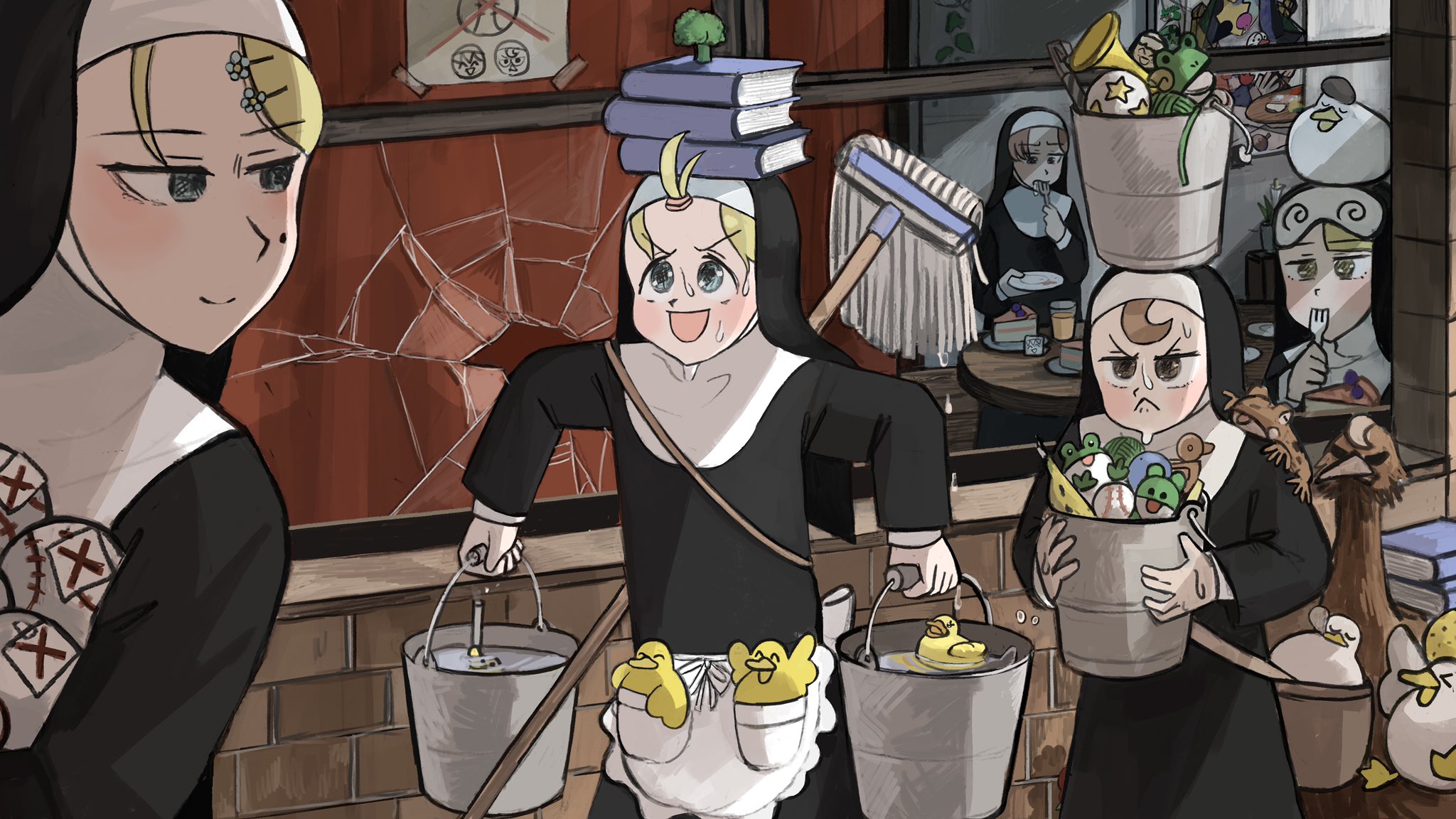 >_< 5girls :< :d ^_^ abstract apron baby_animal bag ball banana bangs_pinned_back baseball bird book book_stack brick_wall broccoli broken_glass broken_window bucket bucket_of_water cake cake_slice chicken closed_eyes clumsy_nun_(diva) cup curtains diva_(hyxpk) doll drinking_glass duck duckling eating eye_mask flower food fork frog froggy_nun_(diva) fruit glass hanging_plant highres holding holding_bucket hungry_nun_(diva) in_bag in_container in_pocket juice lily_(flower) little_nuns_(diva) mask mole mole_under_eye mop multiple_girls nun nun_headdress object_on_head open_mouth orange_juice ostrich painting_(object) plant plate poster_(object) potted_plant rubber_duck satchel shadow slice_of_life smile spicy_nun_(diva) strict_nun_(diva) sweat table topknot toy traditional_nun u_u utensil_in_mouth waist_apron window x_(symbol) yarn yarn_ball