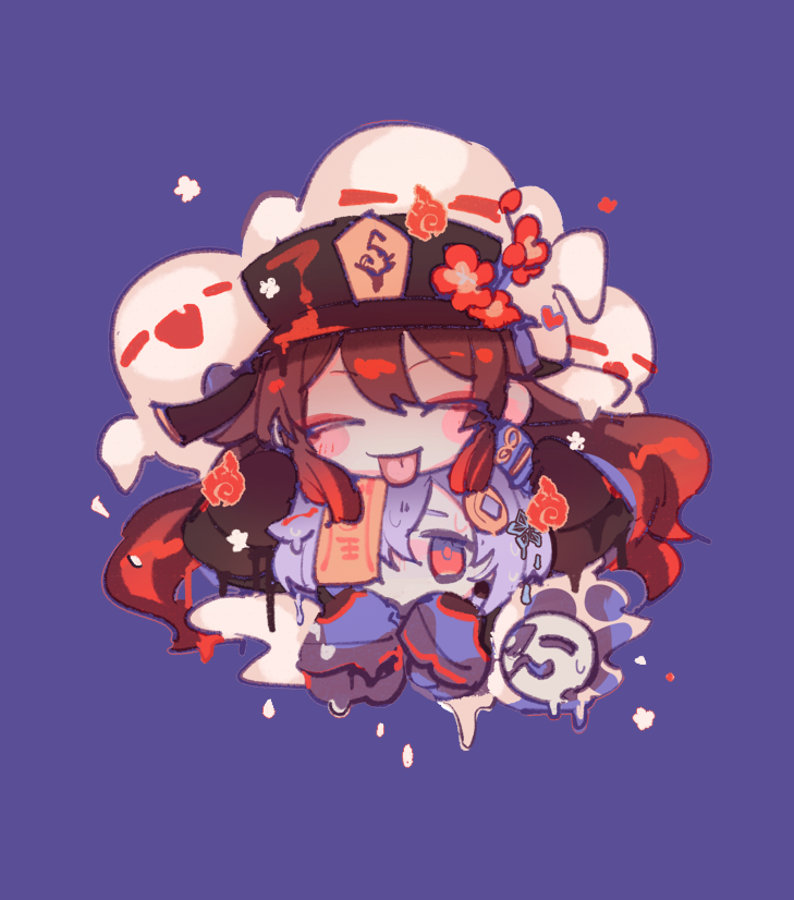 2girls ayano_(katou) black_headwear blush brown_hair chibi flower genshin_impact ghost hair_between_eyes hair_ornament hat hat_flower hu_tao_(genshin_impact) long_hair long_sleeves multicolored_hair multiple_girls ofuda plum_blossoms purple_background purple_hair qiqi_(genshin_impact) red_eyes red_flower red_hair sidelocks simple_background sleeves_past_fingers sleeves_past_wrists tongue twintails