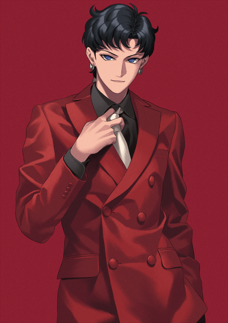 1girl adjusting_clothes adjusting_necktie androgynous arm_at_side bad_id bad_pixiv_id bishoujo_senshi_sailor_moon bishoujo_senshi_sailor_moon_sailor_stars bishoujo_senshi_sailor_moon_stars black_hair black_shirt blue_eyes closed_mouth collared_shirt earrings formal_clothes grey_necktie hand_up jacket jewelry long_sleeves looking_at_viewer necktie red_background red_jacket red_suit seiya_kou shirt short_hair simple_background smile solo sora_yoshitake_yuda suit