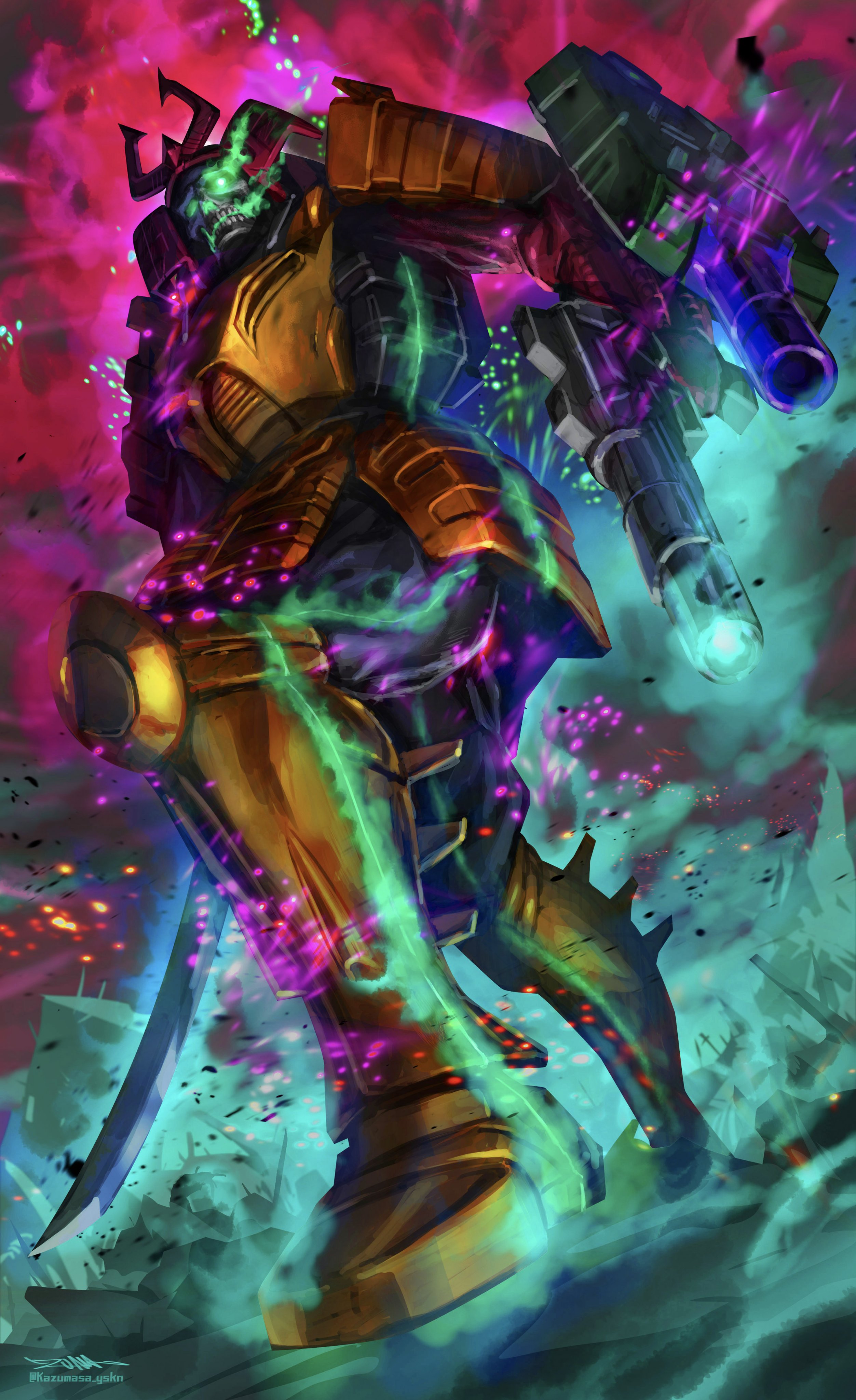1boy absurdres arm_cannon bludgeon_(transformers) deception fire glowing glowing_eyes green_eyes green_fire gun highres holding holding_gun holding_sword holding_weapon katana mecha no_humans robot science_fiction skull solo sword transformers v-fin weapon yasukuni_kazumasa