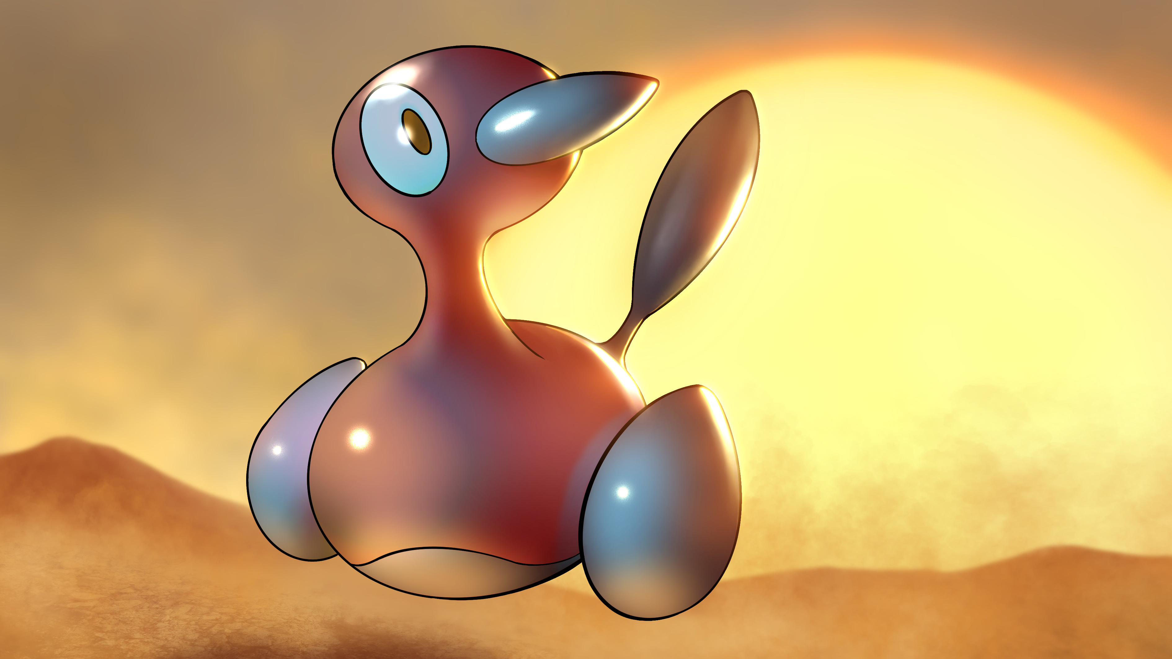 absurdres brown_eyes commentary full_body gen_2_pokemon higa-tsubasa highres looking_to_the_side nintendo no_humans outdoors pokemon pokemon_(creature) pokemon_focus porygon2 solo twilight
