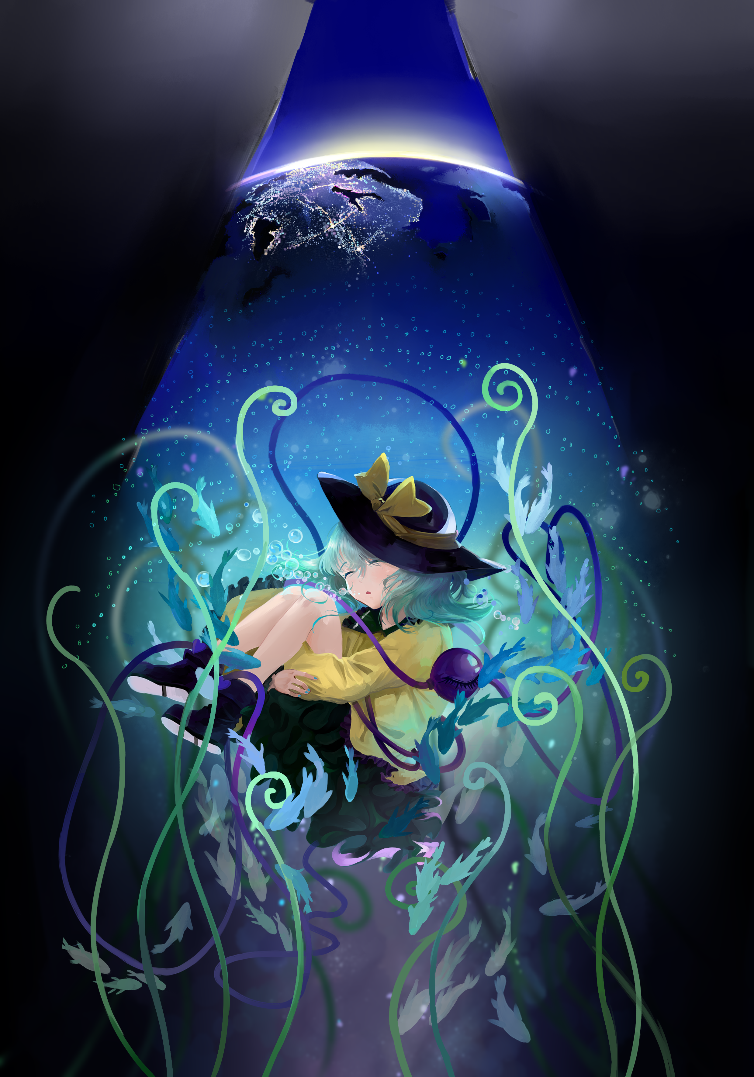1girl absurdres blue_nails bow bowler_hat bubble collared_shirt earth_(planet) eyeball closed_eyes fish frilled_sleeves frills hat hat_ribbon highres komeiji_koishi long_sleeves magic_tofu nail_polish planet ribbon shirt short_hair silver_hair skirt solo third_eye touhou wavy_hair yellow_ribbon yellow_shirt