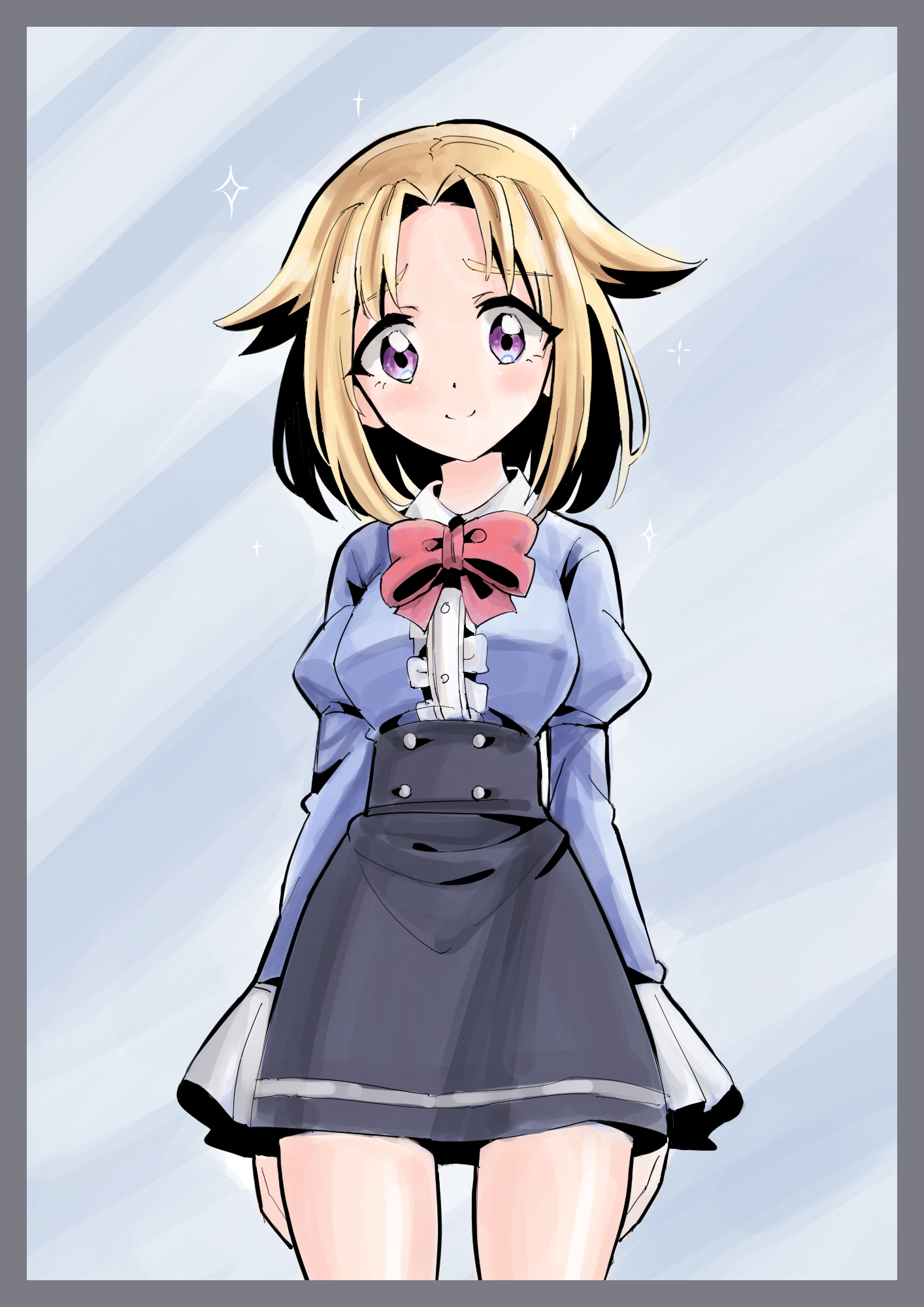 1girl arms_at_sides black_skirt blonde_hair blue_background blue_shirt blush border bow bowtie breasts buttons closed_mouth collared_shirt cowboy_shot female_focus forehead frilled_shirt frills grey_border hair_intakes happy high-waist_skirt highres juliet_sleeves light_blush long_sleeves looking_at_viewer medium_breasts miniskirt miruru_(rune_(dualhart)) original puffy_sleeves purple_eyes red_bow red_bowtie rune_(dualhart) shirt shirt_tucked_in short_hair sidelocks simple_background skirt smile solo sparkle standing straight-on