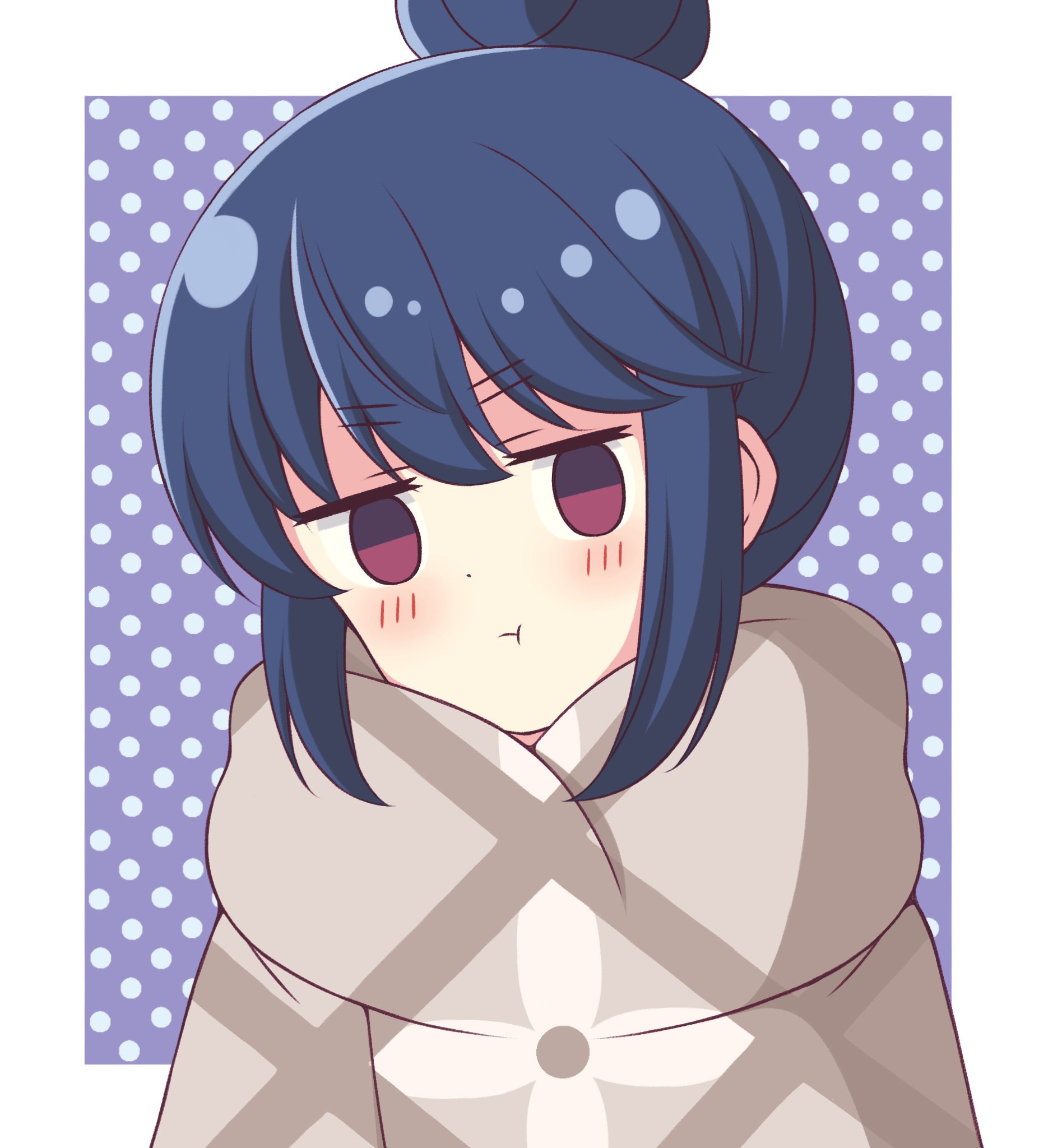 1girl :t bad_id bad_twitter_id blue_hair blush border closed_mouth commentary empty_eyes hair_bun highres jitome looking_at_viewer outside_border polka_dot polka_dot_background pout purple_background purple_eyes shawl shima_rin short_hair sidelocks single_hair_bun solo upper_body white_border yurucamp zeta_(24904340)