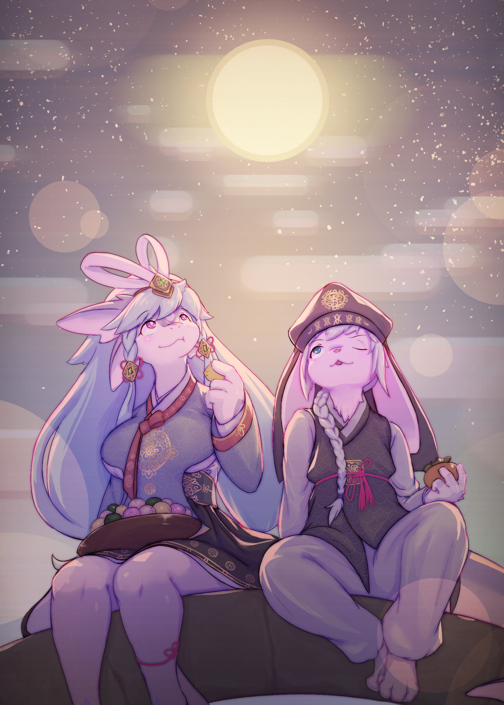 1boy 1girl :3 :t absurdres animal_ears animal_hands animal_nose aqua_eyes arch aruri_(whooo-ya) barefoot black_headwear black_skirt black_vest blue_hair blurry blush body_fur bokeh bowl braid braided_ponytail breasts chima_(clothes) claws cloud colored_skin depth_of_field dessert eating egasumi food fruit full_body full_moon furry furry_female furry_male grey_hair grey_pants grey_shirt grey_skin hair_ribbon hair_tie hand_up happy hat highres holding holding_food holding_fruit jeogori_(clothes) korean_clothes large_breasts leg_ribbon light_blush long_hair long_sleeves looking_up mature_female miniskirt moon multicolored_skin night one_eye_closed open_mouth original outdoors pants persimmon pink_eyes rabbit_boy rabbit_ears red_ribbon ribbon sash shirt sidelocks single_braid sitting skirt sky smile snout songpyeon star_(sky) starry_sky tail tress_ribbon twin_braids two-tone_skin very_long_hair vest white_fur white_skin whooo-ya