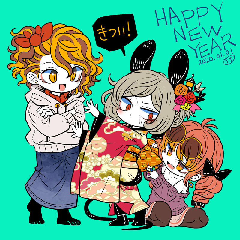3girls animal_ears black_legwear blonde_hair blue_skirt bow brown_hair dated drill_hair earrings eyewear_on_head floral_print flower grey_hair hair_bow hood hoodie jewelry mouse_ears mouse_tail multicolored_hair multiple_girls nazrin obi orange_hair pagoda pink_sweater red_eyes ring sash simple_background skirt sunglasses sweatdrop sweater tail toramaru_shou touhou two-tone_hair yellow_eyes yorigami_jo'on yt_(wai-tei)