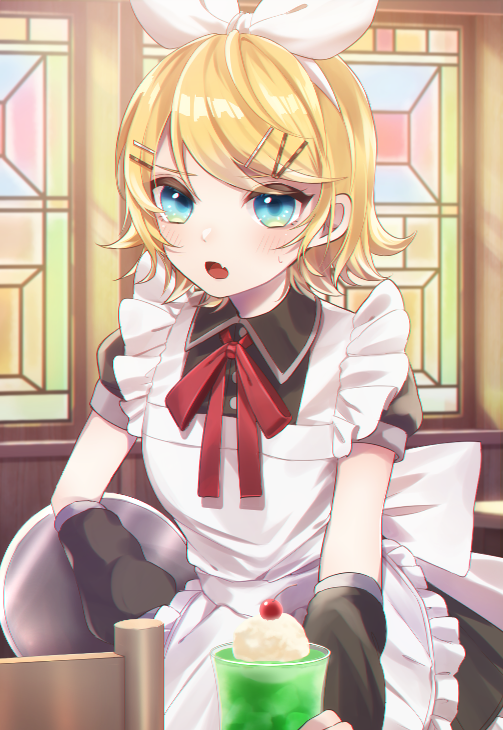 1girl apron arm_warmers black_dress blonde_hair blue_eyes bow chair cherry commentary dress fang food frilled_apron frills fruit hair_bow hair_ornament hairband hairclip highres holding holding_tray ice_cream ice_cream_float indoors kagamine_rin looking_at_viewer neck_ribbon open_mouth red_ribbon ribbon serving short_hair short_sleeves skin_fang solo soramame_pikuto stained_glass standing sweat swept_bangs tray upper_body vocaloid waitress white_apron white_bow window