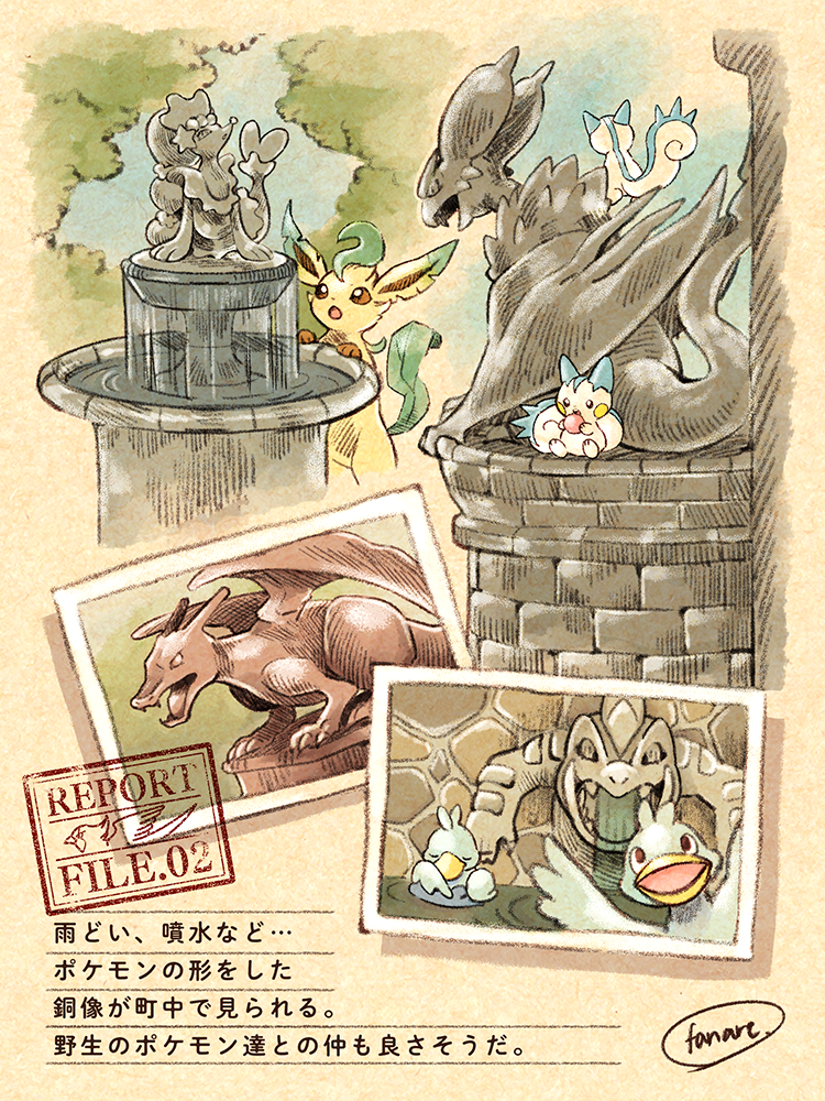 brown_eyes charizard commentary_request day ducklett eating feraligatr fountain gen_1_pokemon gen_2_pokemon gen_3_pokemon gen_4_pokemon gen_5_pokemon gen_6_pokemon gen_7_pokemon holding leafeon looking_up matsuri_(matsuike) nintendo no_humans noivern open_mouth outdoors pachirisu photo_(object) pokemon pokemon_(creature) primarina ripples statue stone swellow toes translation_request water water_from_mouth