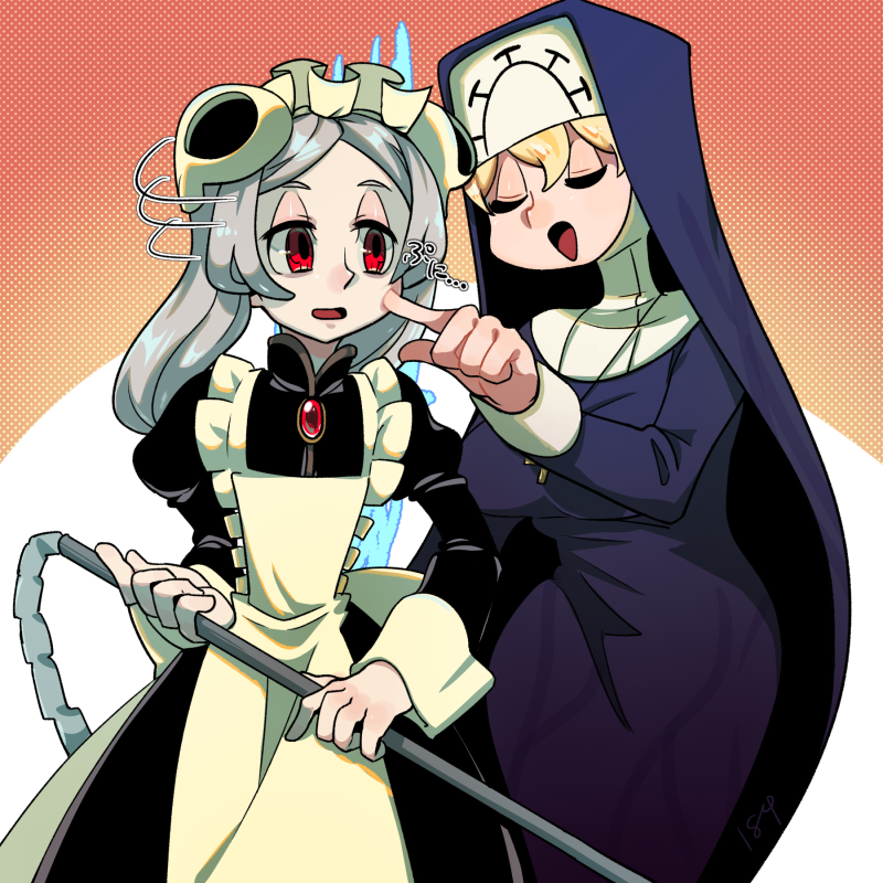 184nx 1koma 2girls blonde_hair bloody_marie_(skullgirls) brooch closed_eyes comic cross cross_necklace dotted_background double_(skullgirls) dress exposed_bone fire grey_hair habit hair_ornament jewelry multiple_girls necklace nun open_mouth orange_background patting red_eyes ribs skull_hair_ornament skullgirls twintails vacuum_cleaner white_background