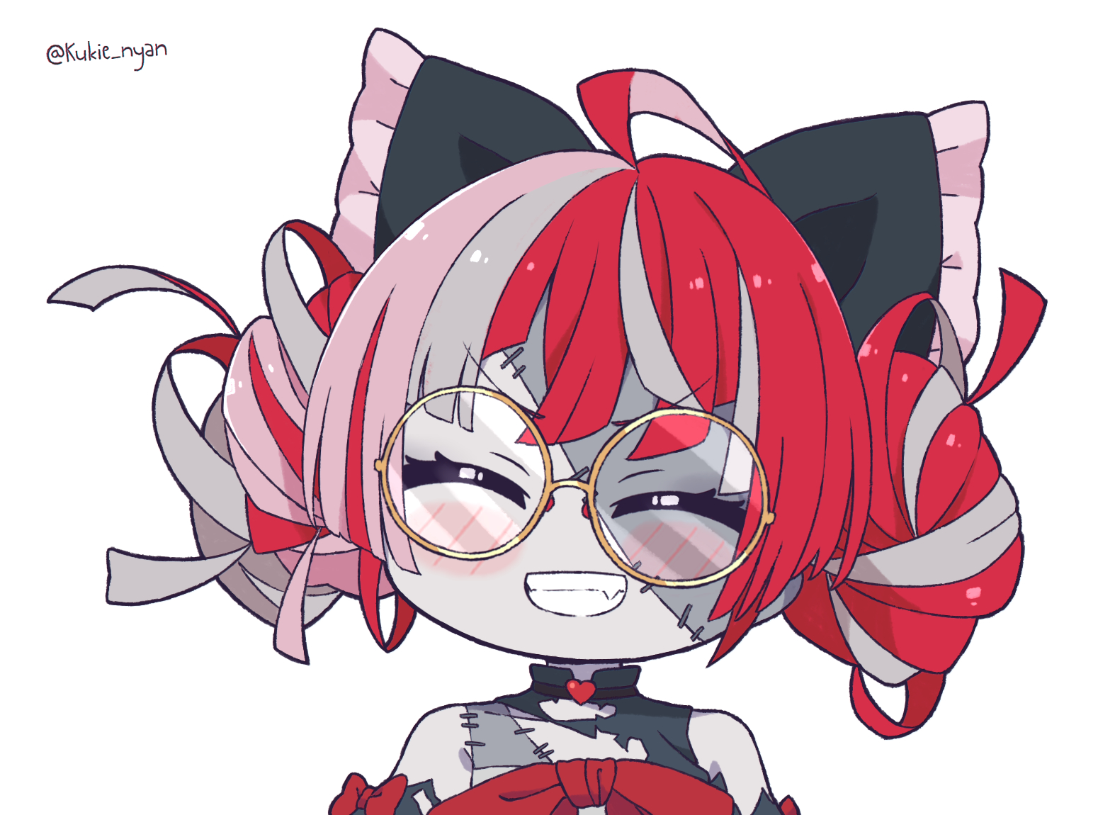 1girl ahoge bare_shoulders blush_stickers bow chibi double_bun closed_eyes glasses grey_hair grin hair_bow hair_bun hololive hololive_indonesia kukie-nyan kureiji_ollie multicolored_hair patchwork_skin pink_hair red_eyes round_eyewear smile solo stitched_face stitched_torso stitches torn_clothes twitter_username virtual_youtuber zombie