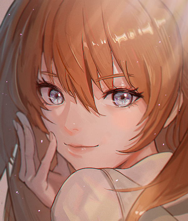 1girl blue_eyes brown_hair closed_mouth commentary_request fingernails hair_between_eyes hand_up korean_commentary lips looking_at_viewer looking_back mixed-language_commentary moth1 neon_genesis_evangelion partial_commentary portrait rebuild_of_evangelion simple_background smile solo souryuu_asuka_langley