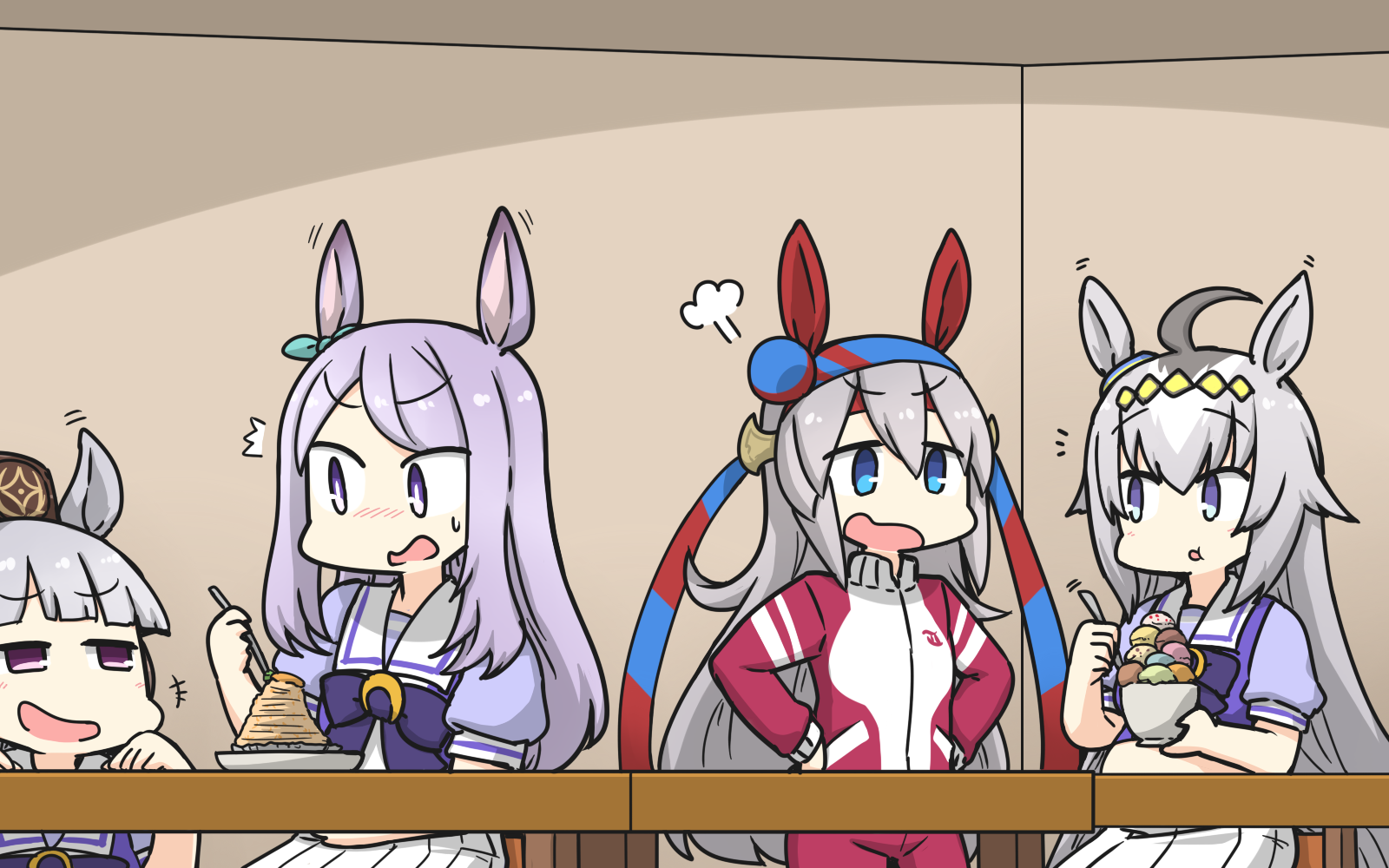 4girls ahoge animal_ears big_belly blue_eyes blush character_request commentary_request dress eating food full_stomach grey_hair hamu_koutarou highres holding horse_ears horse_girl multiple_girls oguri_cap_(umamusume) open_mouth puffy_short_sleeves puffy_sleeves purple_eyes purple_hair purple_shirt sailor_collar sailor_dress school_uniform shirt short_sleeves skirt tracen_school_uniform umamusume white_skirt