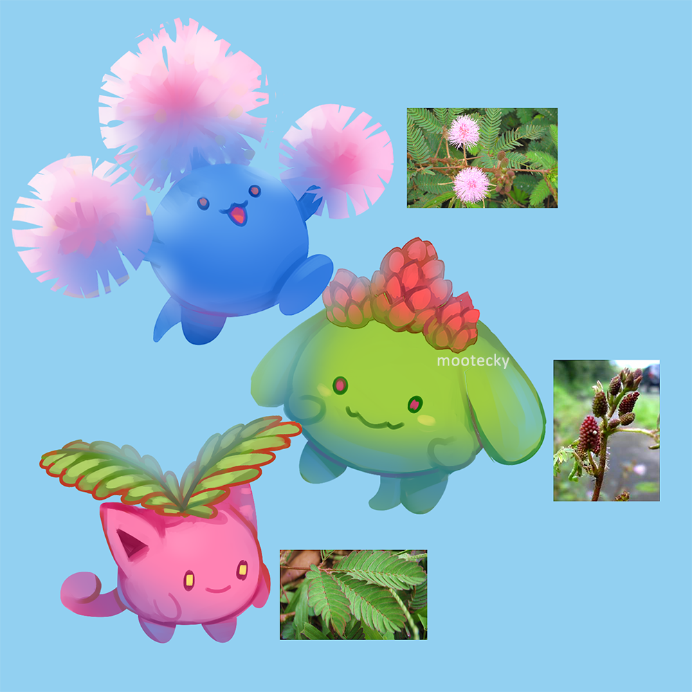 artist_name blue_background closed_mouth commentary english_commentary evolutionary_line gen_2_pokemon hoppip jumpluff mootecky nintendo no_humans open_mouth photo-referenced photo_inset pokemon pokemon_(creature) skiploom smile tongue watermark yellow_eyes