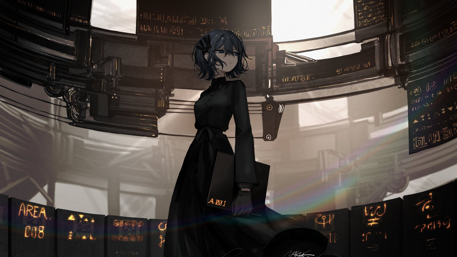 1girl black_gloves black_hair black_shirt black_skirt blue_eyes rabbit_hair_ornament collared_shirt dress_shirt feet gloves hair_between_eyes hair_ornament highres holding indoors lens_flare long_skirt looking_to_the_side narue original science_fiction shirt short_hair signature skirt solo standing