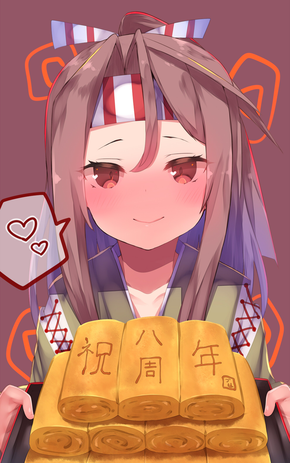 1girl atsutoku bad_id bad_pixiv_id blush brown_eyes collarbone food hachimaki headband heart high_ponytail highres holding holding_food kantai_collection light_brown_hair long_hair omelet ponytail smile solo speech_bubble spoken_heart tamagoyaki upper_body zuihou_(kancolle)