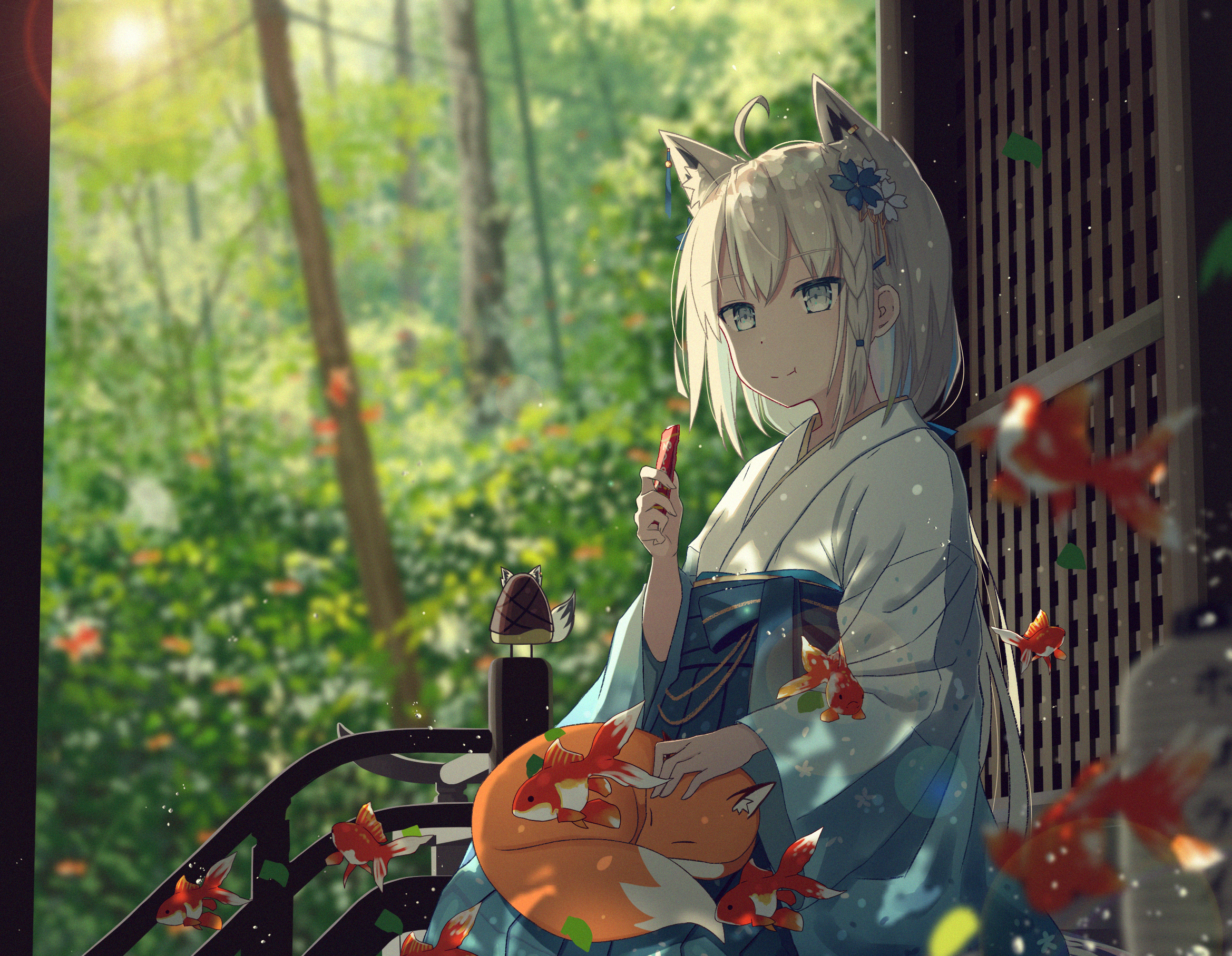 1girl ahoge animal_ear_fluff animal_ears bad_id bad_pixiv_id blue_kimono blurry blurry_background braid commentary_request fish flower forest fox fox_ears fox_girl fox_tail goldfish green_eyes hair_between_eyes hair_flower hair_ornament highres holding hololive japanese_clothes kimono koyuki_ekaki lantern long_hair looking_at_viewer nature oruyanke_(shirakami_fubuki) outdoors paper_lantern shirakami_fubuki shirakami_fubuki_(new_year) sidelocks single_braid sitting tail virtual_youtuber white_hair
