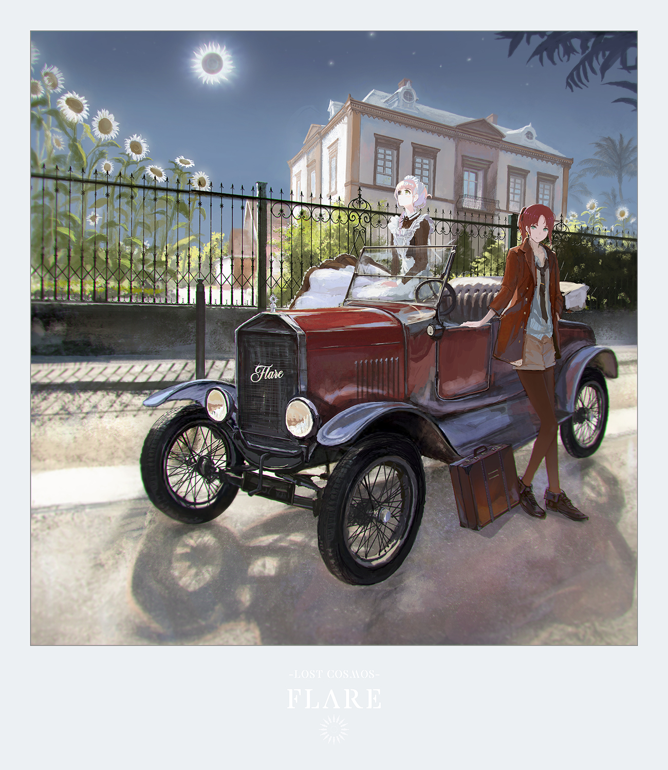 2girls apron blue_eyes car convertible fake_photograph fence flower fujiya_mahiro green_eyes highres house jacket light_purple_hair maid maid_apron maid_headdress motor_vehicle multiple_girls necktie original palm_tree pantyhose pantyhose_under_shorts polaroid_photo ponytail red_hair scenery shadow short_ponytail shorts star_(sky) suitcase sun sunflower tree vehicle_focus