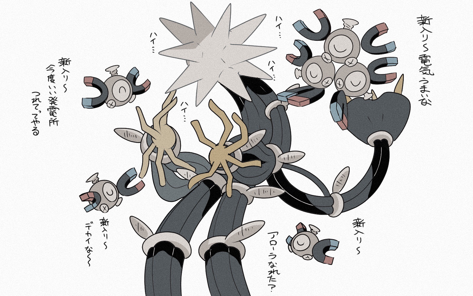 ^_^ closed_eyes commentary_request floating gen_1_pokemon gen_7_pokemon happy highres magnemite magneton nintendo no_humans pokemon pokemon_(creature) simple_background translation_request u_u ultra_beast white_background xurkitree yukifuri_tsuyu