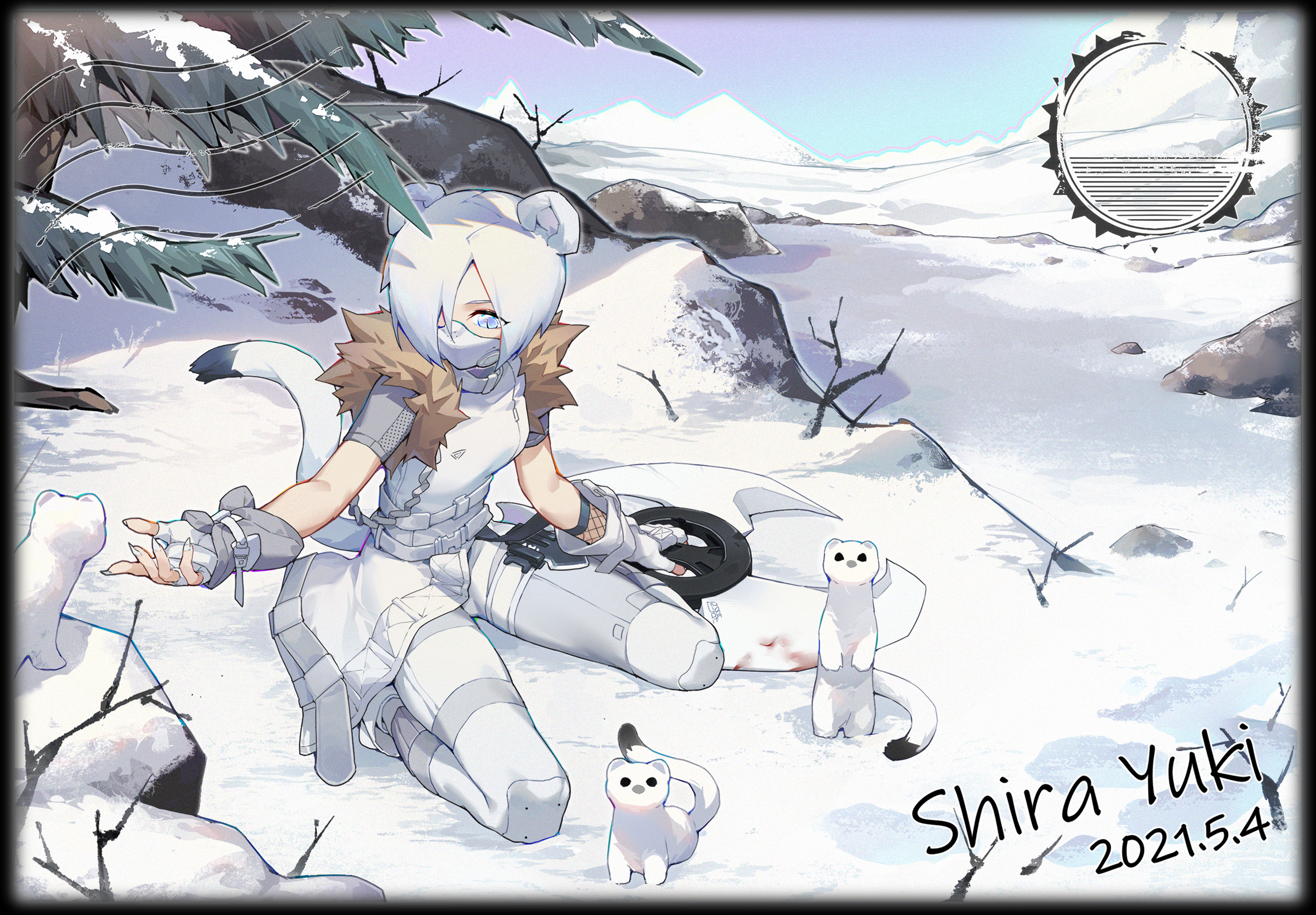 1girl animal animal_ears arknights blue_eyes breasts character_name commentary_request dated dress ermine ferret fingerless_gloves fingernails full_body fur_trim fuuma_shuriken gloves hair_over_one_eye hidor highres holding_shuriken holding_weapon looking_at_animal mask mouth_mask official_alternate_costume outdoors outstretched_arm pantyhose sharp_fingernails shirayuki_(arknights) shirayuki_(wind_of_breaking_blade)_(arknights) short_hair short_sleeves shuriken snow solo stoat_girl tail tail_raised tree weasel weasel_ears weasel_tail white_dress white_gloves white_hair white_pantyhose