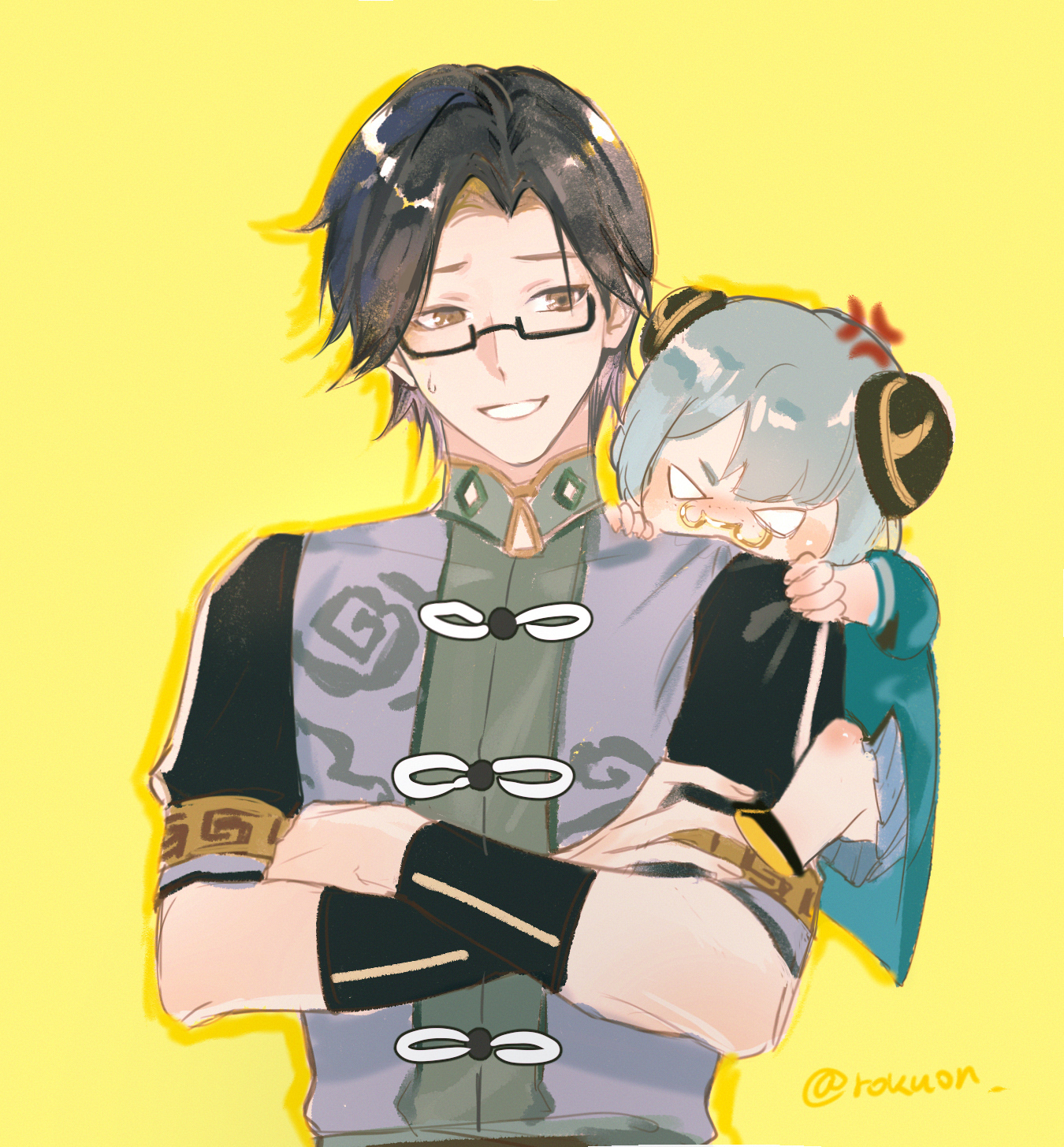 1boy 1girl anger_vein azhdaha_(genshin_impact) biting black_hair blue_hair brown_eyes child chinese_clothes commentary_request crossed_arms double_bun dual_persona genshin_impact glasses hair_bun highres open_mouth rokuon short_hair short_sleeves spoilers sweat yellow_background