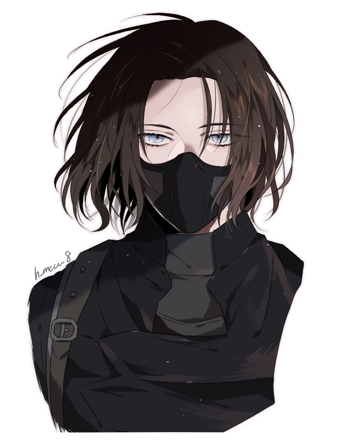 1boy animification blue_eyes brown_hair captain_america:_the_winter_soldier captain_america_(series) captain_america_the_winter_soldier holster bucky_barnes long_hair male_focus marvel marvel mask namahamu_(hmhm_81) parted_bangs shoulder_holster solo upper_body winter_soldier