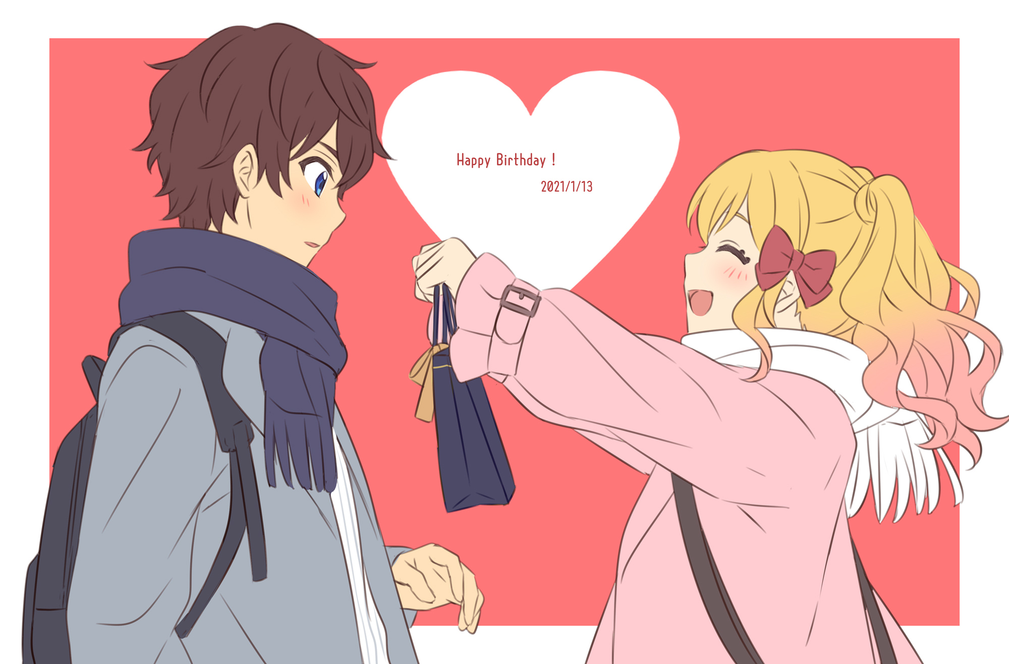 1boy 1girl :d aikatsu!_(series) aikatsu_stars! backpack bad_id bad_twitter_id bag blue_eyes blue_scarf border bow brown_hair closed_eyes couple giving gradient_hair grey_jacket hair_bow highres jacket long_sleeves medium_hair multicolored_hair nijino_yume open_mouth parted_lips pink_jacket red_bow scarf sekina smile twintails white_border white_scarf yuuki_subaru