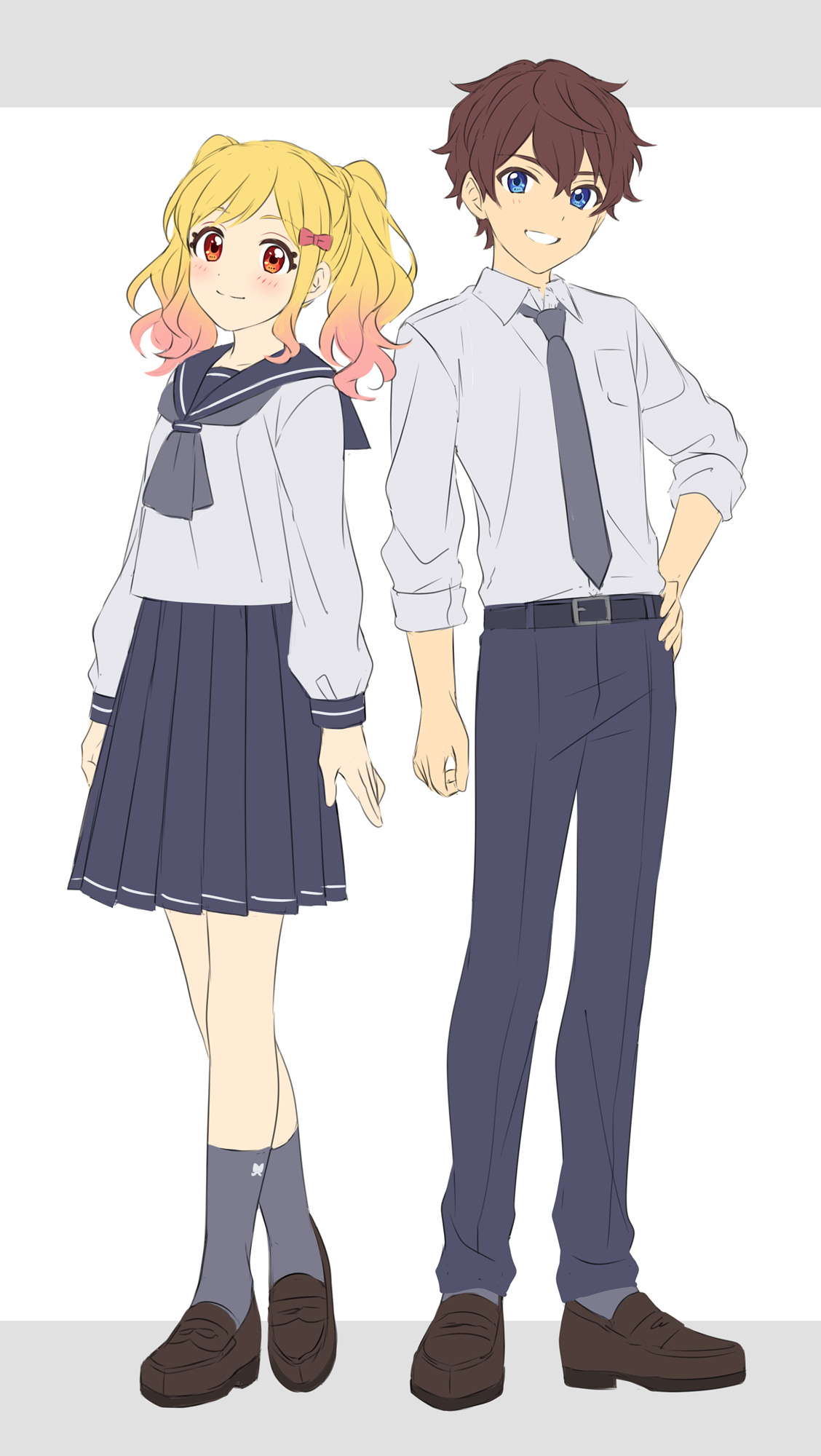 1boy 1girl aikatsu!_(series) aikatsu_stars! bad_id bad_twitter_id belt black_belt black_pants black_skirt blonde_hair blue_eyes bow brown_footwear brown_hair closed_mouth collared_shirt couple flat_color gradient_hair grey_legwear grey_neckwear grey_shirt hair_bow hand_on_own_hip highres loafers looking_at_viewer multicolored_hair neckerchief necktie nijino_yume pants pink_bow pink_hair pleated_skirt red_eyes school_uniform sekina serafuku shirt shoes simple_background skirt smile socks twintails white_background wing_collar yuuki_subaru