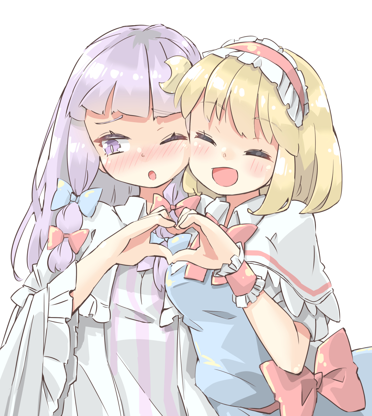 2girls :o alice_margatroid arnest blonde_hair blue_bow blue_dress blunt_bangs blush bob_cut bow bowtie bright_pupils capelet commentary_request crescent crescent_hair_ornament dress embarrassed frilled_hairband frilled_sleeves frills furrowed_brow hair_bow hair_ornament hairband happy heart heart_hands heart_hands_duo highres lolita_hairband long_hair long_sleeves looking_away looking_to_the_side multiple_girls missing_headwear nose_blush one_eye_closed open_mouth pajamas patchouli_knowledge purple_dress purple_eyes purple_hair red_bow red_hairband red_neckwear red_sash sash short_hair sideways_glance simple_background smile striped_clothes striped_dress touhou vertical-striped_clothes vertical-striped_dress white_background white_capelet white_dress white_pajamas white_pupils wide_sleeves wing_collar wrist_cuffs