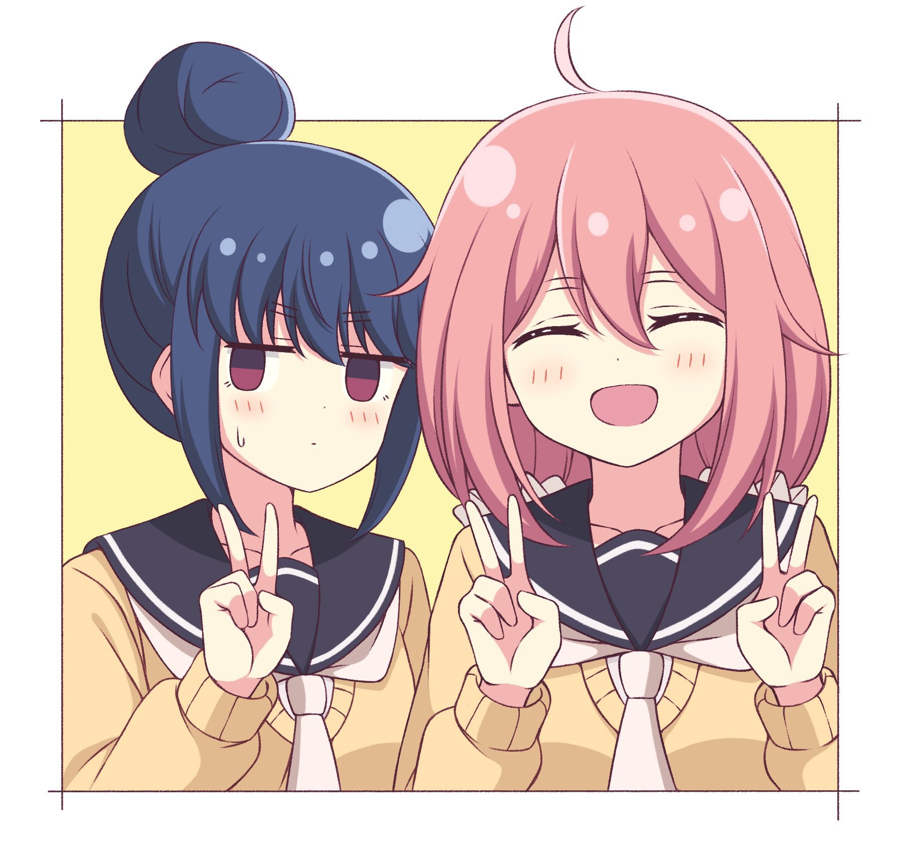 2girls :d ahoge bad_id bad_twitter_id black_sailor_collar blue_hair blush border closed_eyes closed_mouth collarbone commentary double_v empty_eyes facing_viewer grey_neckwear hair_between_eyes hair_bun happy highres jitome kagamihara_nadeshiko long_hair long_sleeves looking_at_viewer multiple_girls necktie open_mouth pink_hair purple_eyes sailor_collar school_uniform shima_rin short_hair sidelocks simple_background single_hair_bun smile split_mouth sweater upper_body v white_border yellow_sweater yurucamp zeta_(24904340)