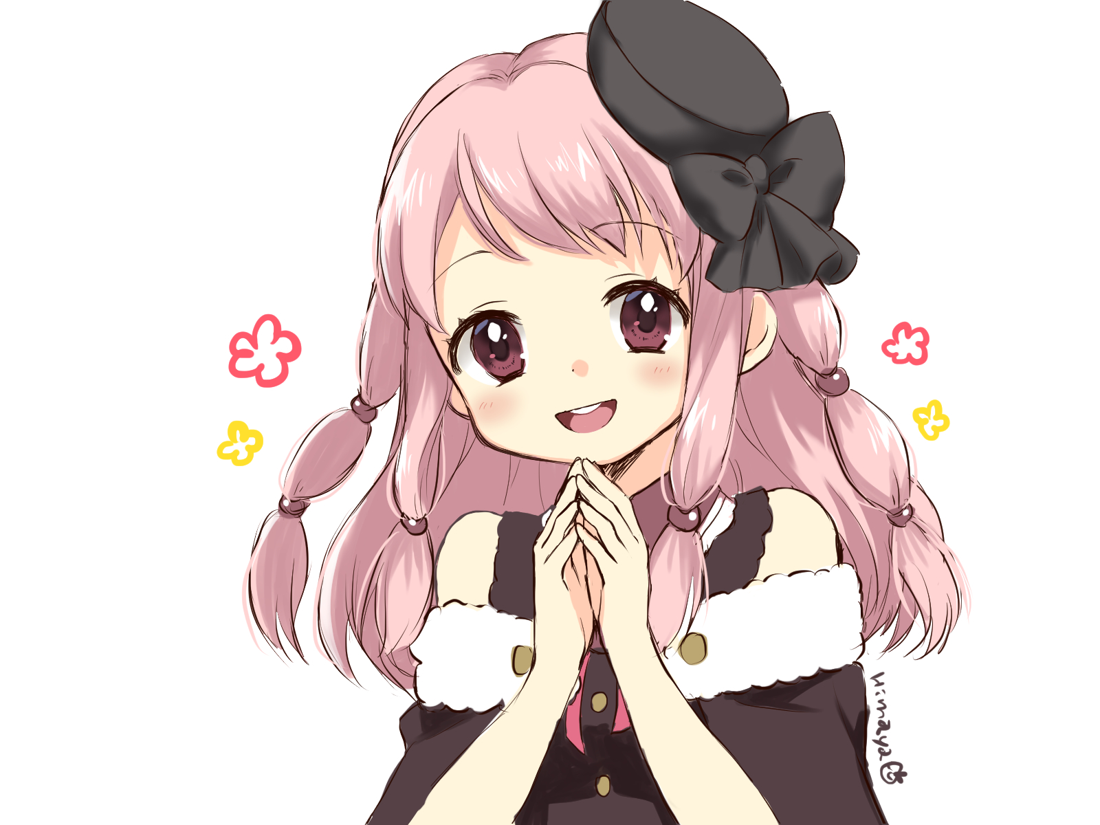 1girl :d artist_name bare_shoulders beret black_capelet black_hat black_ribbon braid buttons capelet dot_nose floral_background flower fur-trimmed_capelet fur_trim hair_bobbles hair_ornament hands_up happy hat head_tilt highres himaya light_blush looking_at_viewer magia_record:_mahou_shoujo_madoka_magica_gaiden magical_girl mahou_shoujo_madoka_magica medium_hair multiple_braids open_mouth own_hands_together pink_eyes pink_hair red_flower ribbon round_teeth signature simple_background smile solo steepled_fingers tamaki_ui tareme teeth upper_body upper_teeth_only white_background yellow_flower