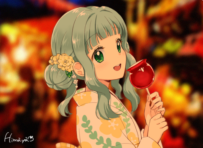 1girl alternate_costume alternate_hairstyle artist_name blunt_bangs blurry blurry_background candy_apple close-up dot_nose eyelashes facing_viewer fingernails floral_print flower food futaba_sana green_eyes green_hair hair_bun hair_flower hair_ornament hands_up happy himaya holding holding_food japanese_clothes kimono leaf_print light_blush looking_afar magia_record:_mahou_shoujo_madoka_magica_gaiden mahou_shoujo_madoka_magica open_mouth round_teeth sidelocks single_hair_bun solo tareme teeth upper_body upper_teeth_only white_kimono yellow_flower
