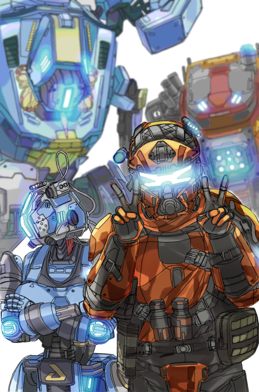 1boy 1girl blue_eyes crossed_arms double_v explosive extra_eyes glowing glowing_eyes grenade highres humanoid_robot kotone_a legion_(titanfall_2) looking_at_viewer looking_down looking_to_the_side mecha northstar_(titanfall) pouch robot science_fiction simulacrum_(titanfall) titanfall_(series) titanfall_2 v visor