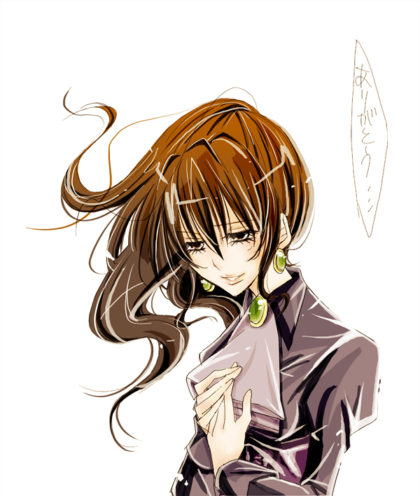 00s 1girl ascot bad_id bad_pixiv_id brown_eyes brown_hair earrings female_focus gem gigi hands_on_own_chest jewelry long_hair side_ponytail smile solo translated umineko_no_naku_koro_ni ushiromiya_natsuhi white_background