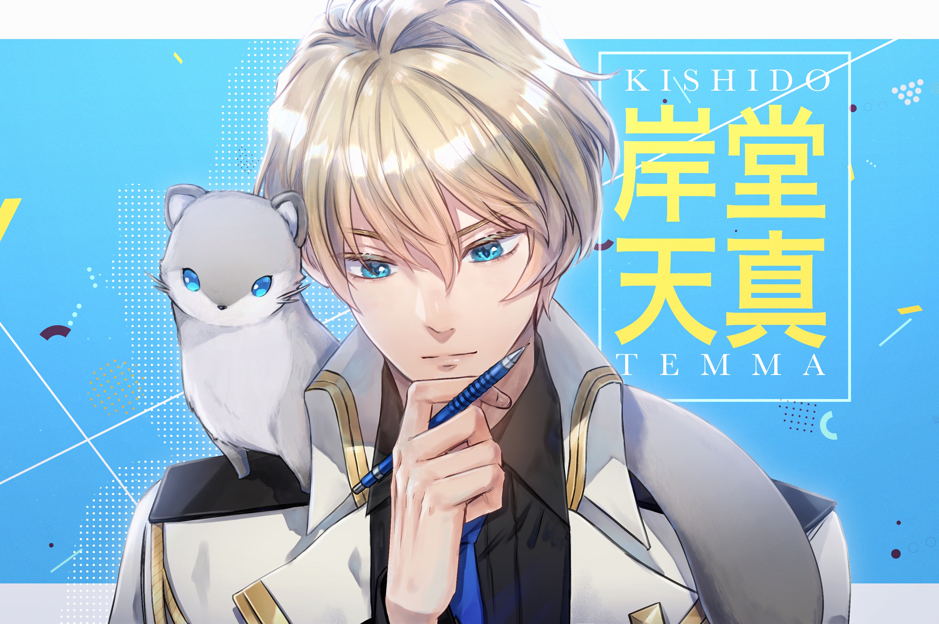 1boy animal animal_on_shoulder black_shirt blonde_hair blue_eyes blue_necktie character_name collared_shirt commentary english_commentary ferret hair_between_eyes hand_on_own_chin head_tilt highres hiyamaru holding holding_pen holostars jacket kishido_temma kishido_temma_(1st_costume) lins_(linszhz) male_focus necktie pen shirt solo thinking virtual_youtuber white_jacket