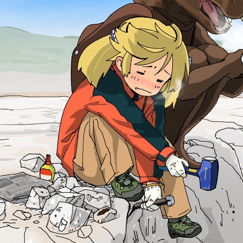 1girl akai_sashimi blonde_hair blue_sky blush brown_pants day dinosaur closed_eyes hammer jacket knee_up long_hair mizunami_fossil_museum mizunami_mio orange_jacket outdoors pants rock shoes sitting sky solo twintails