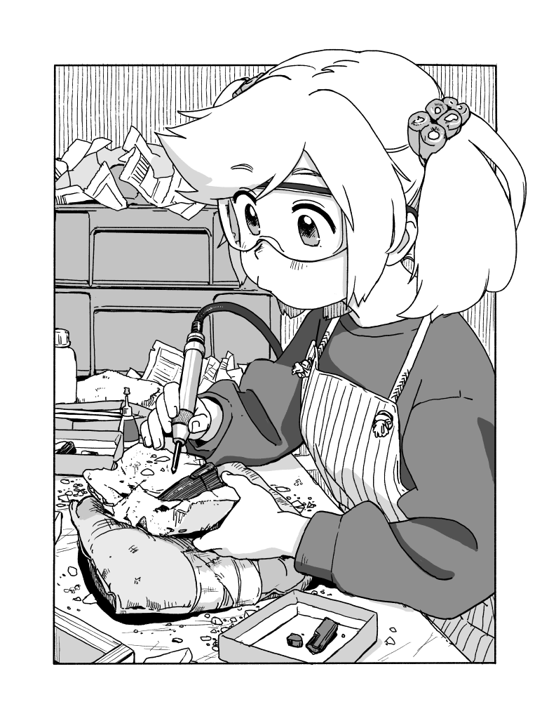 1girl akai_sashimi drill fossil goggles greyscale long_sleeves mizunami_fossil_museum mizunami_mio monochrome solo twintails upper_body