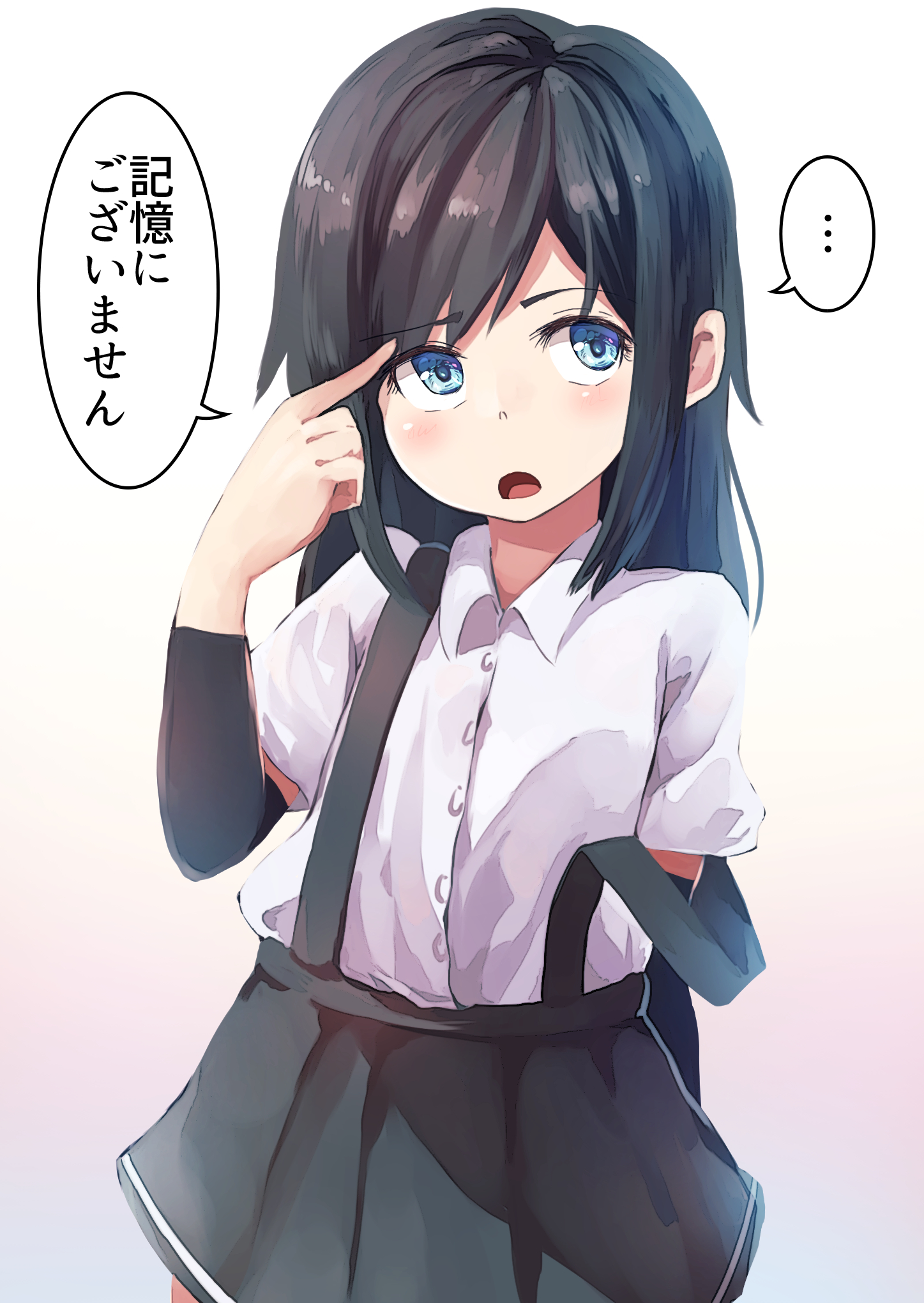 ... 1girl arm_warmers asashio_(kancolle) black_hair blue_eyes blush collared_shirt cowboy_shot grey_skirt highres kantai_collection long_hair open_mouth pleated_skirt shirt short_sleeves skirt solo speech_bubble spoken_ellipsis taisho_(gumiyuki) translated white_shirt