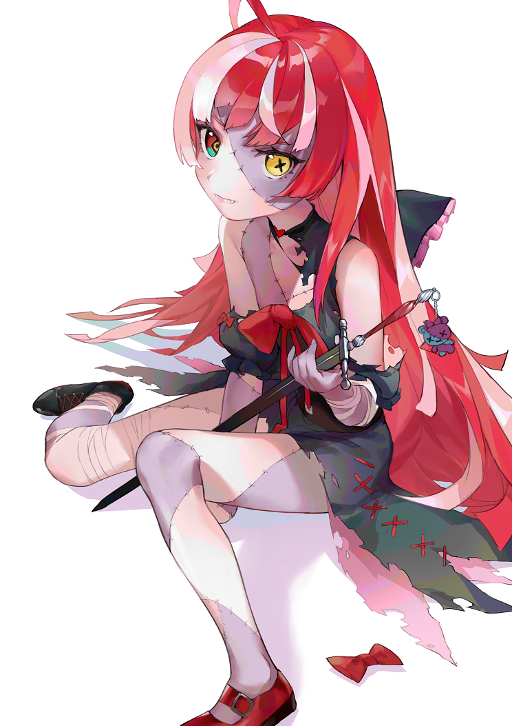1girl ahoge alternate_hairstyle asymmetrical_footwear bandaged_arm bandaged_leg bandages bare_shoulders black_dress closed_mouth dress fang fang_out g_li green_eyes hair_down heterochromia holding holding_sword holding_weapon hololive hololive_indonesia holoro kureiji_ollie long_hair looking_at_viewer mismatched_footwear mismatched_pupils patchwork_skin red_eyes red_hair sitting solo stitched_arm stitched_face stitched_leg stitched_torso stitches sword symbol-shaped_pupils torn_clothes torn_dress udin_(kureiji_ollie) virtual_youtuber weapon white_hair x-shaped_pupils yellow_eyes zombie