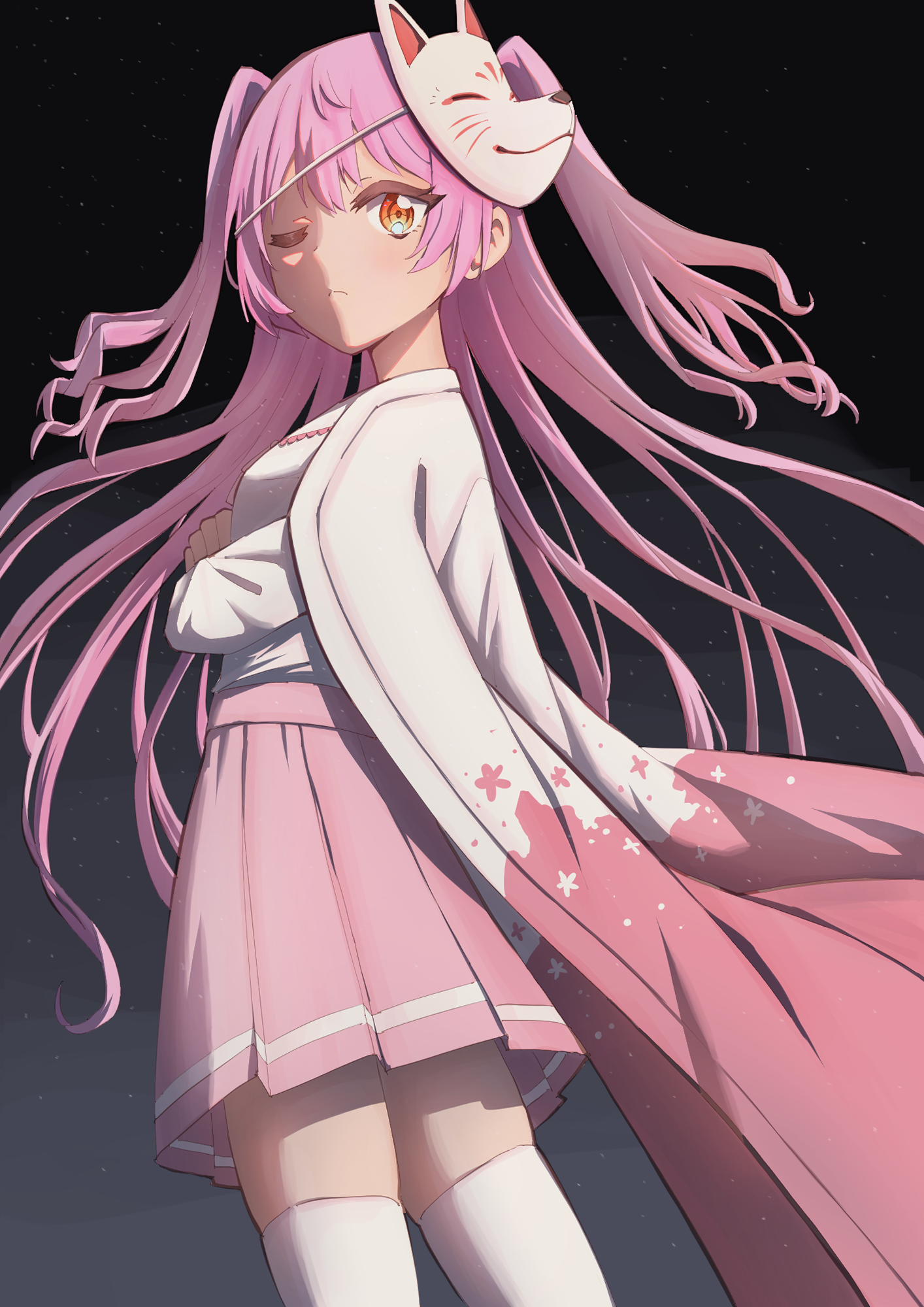 1girl black_background blush breasts cape cowboy_shot crossed_arms female_focus fox_mask from_behind gradient_background highres light_blush light_particles long_hair looking_at_viewer mask mask_on_head miniskirt neck_ribbon one_eye_closed orange_eyes original pink_cape pink_hair pink_ribbon pink_skirt pleated_skirt ribbon rita_(rune_(dualhart)) rune_(dualhart) school_uniform shirt shirt_tucked_in sidelocks simple_background skirt small_breasts solo standing thighhighs two-tone_cape two_side_up white_shirt white_thighhighs zettai_ryouiki