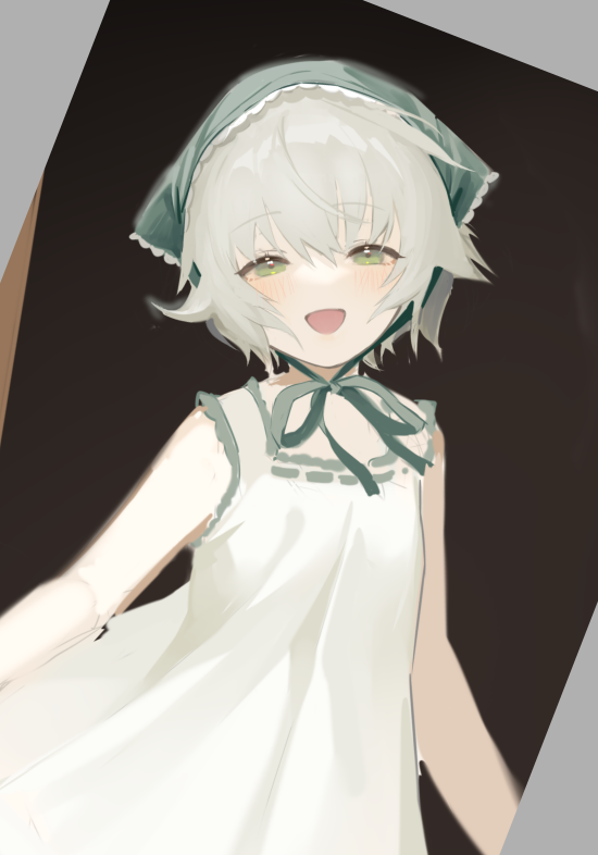 1girl black_background child cowboy_shot doorway dress eyes_visible_through_hair fei_(songyijie) frilled_dress frills green_eyes grey_background knot light_blush looking_at_viewer messy_hair nier nier_(series) short_hair silver_hair simple_background sleeveless sleeveless_dress smile solo white_dress yonah