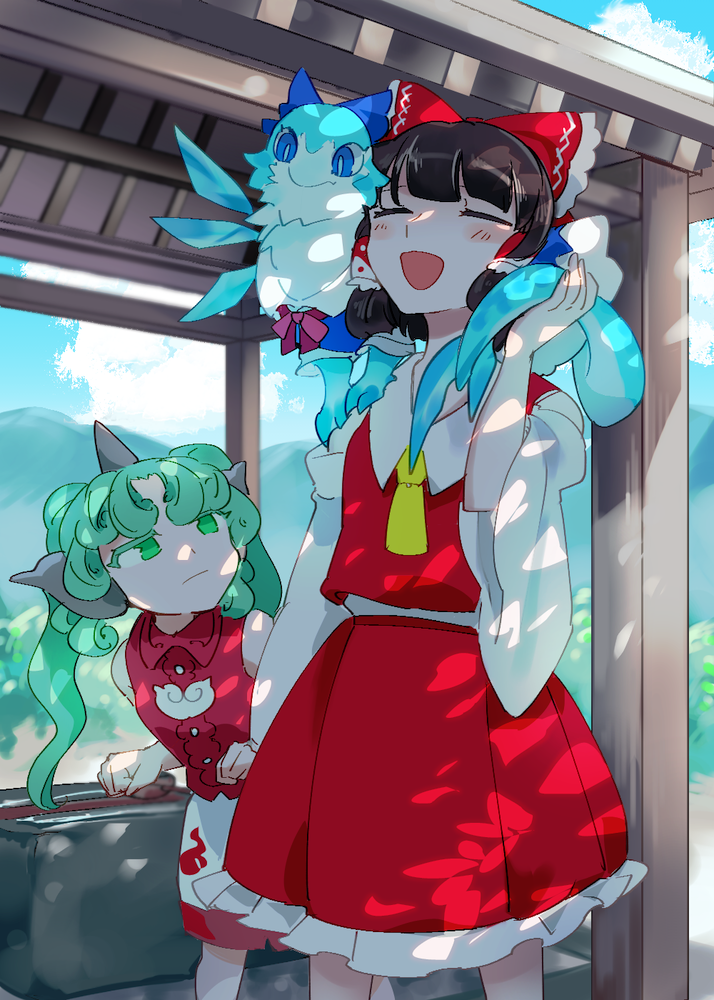 2girls :d animalization ascot blue_bow blue_dress blue_eyes blunt_bangs blush bow chamaruk cirno clenched_hands closed_eyes closed_mouth cloud_print collared_vest creature creature_on_shoulder curly_hair day detached_sleeves dress fang frilled_bow frilled_skirt frills green_eyes green_hair hair_bow hair_tubes hakurei_reimu hand_up hill hishaku holding_another's_tail horns ice ice_wings jitome komano_aunn leaning_forward looking_at_another looking_to_the_side looking_up multiple_girls neck_ribbon on_shoulder open_mouth outdoors print_shorts red_bow red_ribbon red_skirt red_vest ribbon shorts skin_fang skirt skirt_set slit_pupils smile standing tail temizuya touhou twintails vest white_shorts white_skirt white_sleeves wide_sleeves wings yellow_neckwear |d