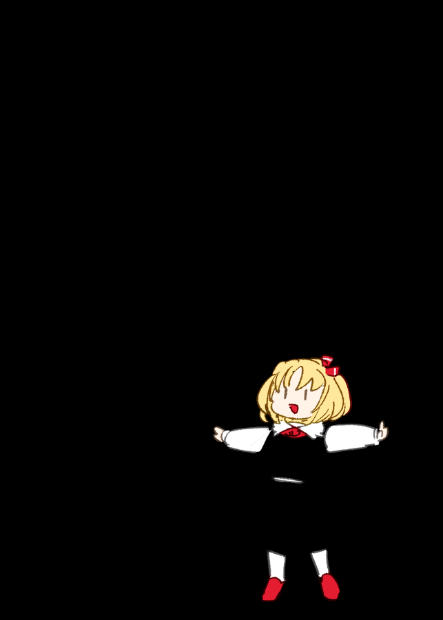 1girl :d black_background black_skirt black_theme black_vest blending blonde_hair chamaruk collared_shirt long_sleeves medium_hair negative_space open_mouth outstretched_arms red_neckwear red_shoes rumia shirt shoes simple_background skirt skirt_set smile solo spread_arms standing t-pose touhou vest white_shirt wide_shot |_|